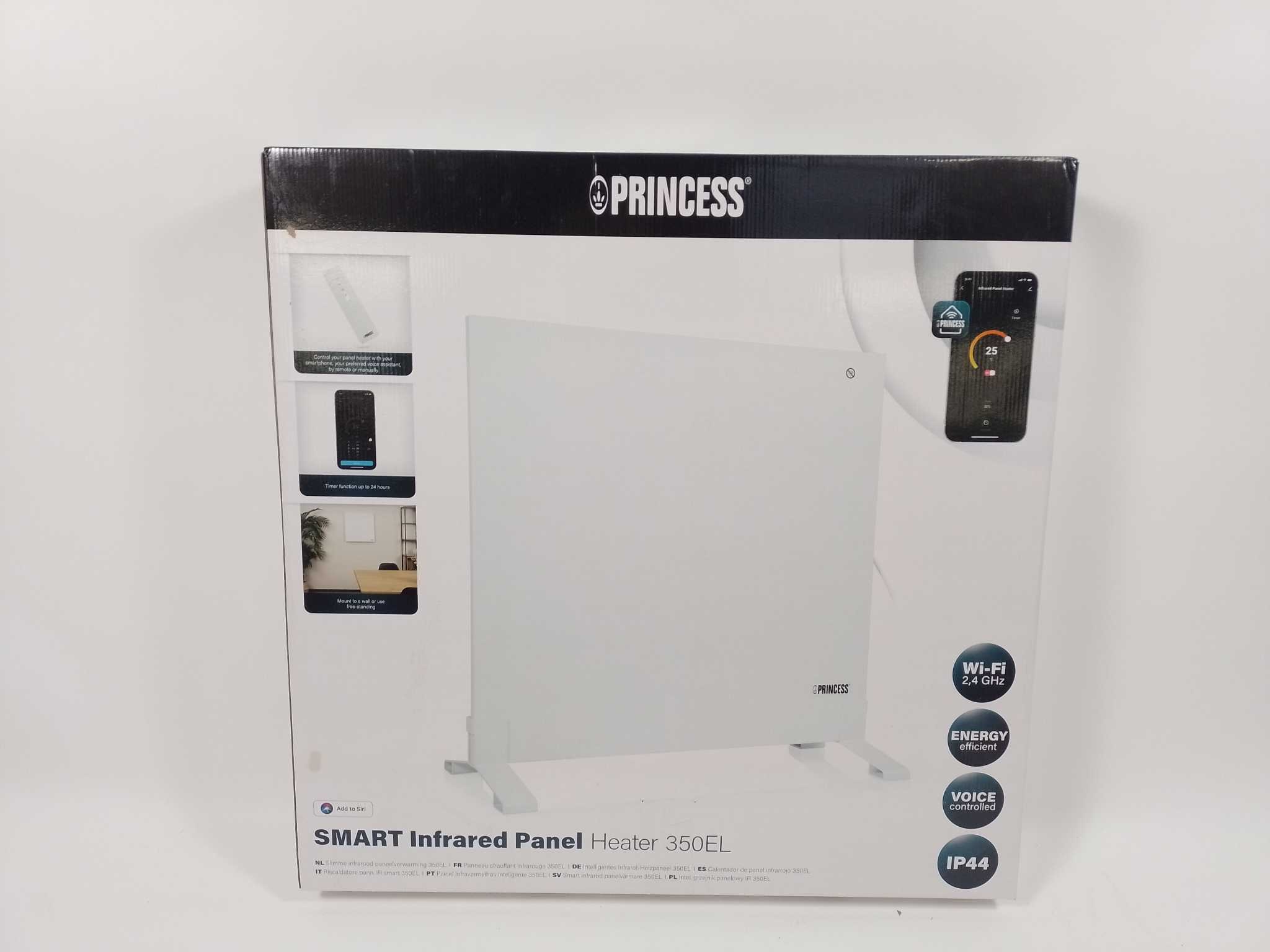 Princess Infaroodkachel 350W - 60x60x2 cm - Wit. De Princess Smart infrarood paneelverwarming 350EL (350W) verwarmt mensen en objecten direct voor snelle, comfortabele warmte zonder droge lucht. Via wifi bedien je hem met app en spraakassistent, en stel je met thermostaat en 24-uurs timer slimme schema’s in voor lager verbruik. Met energiemeting houd je inzicht in kosten. Het randloze 60×60 cm paneel staat vrij of hangt strak aan de muur. Stil in gebruik en spatwaterdicht, ideaal voor kleine ruimtes tot circa 24 m³. Inclusief voeten, muurbeugel en handleiding.