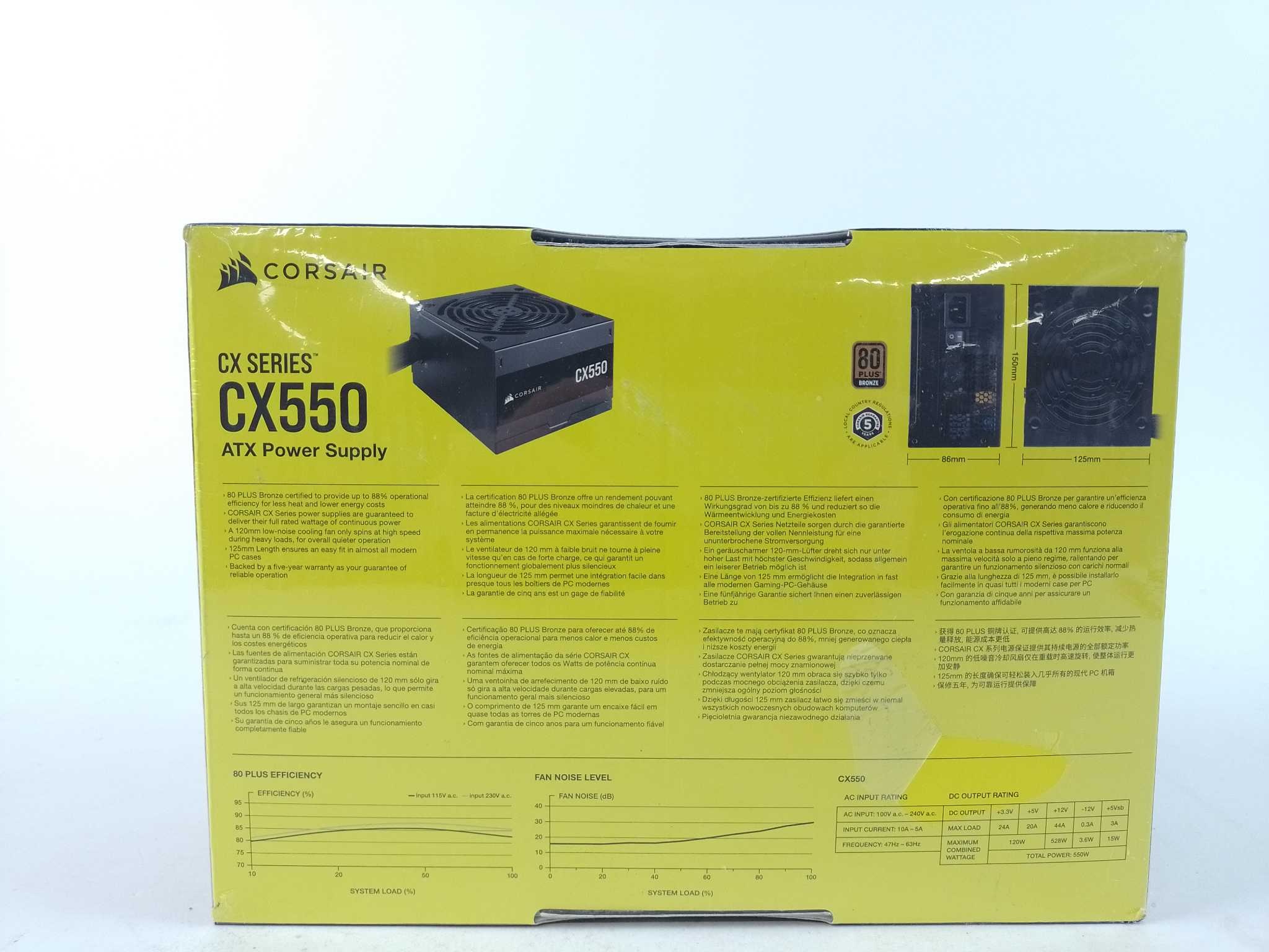 Corsair Interne Voeding CX550. De Corsair CX550 ATX-voeding levert stabiele 550 watt voor gaming-pc’s en upgrades. 80 PLUS Bronze efficiëntie tot 88% vermindert warmte en stroomverbruik, terwijl de stille 120 mm ventilator koel blijft. Het compacte 125 mm