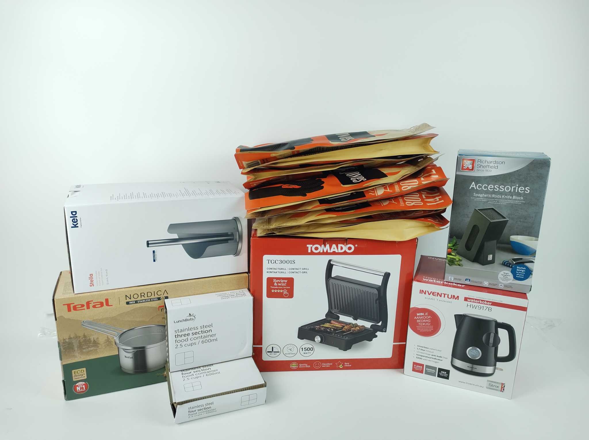Voordeelbox Keuken & BBQ #2. Deze Voordeelbox Keuken & BBQ bevat: 15 artikelen (8 uniek) met o.a. 8x Grill Master barbecuehandschoenen (The Original), een Tomado XXL tosti-/contactgrill (PFAS-vrij, instelbare temperatuur), Inventum retro waterkoker 1,7L met temperatuurindicator, Tefal Nordica steelpan (inductie/RVS), een universeel messenblok, Kela Stella keukenrolhouder én twee lunchboxen (Medium Trio turquoise + Medium Quad groen). Totale winkelwaarde ca. €455,14, maar bij retourplaza scoor je ’m als scherpe voordeelbox. Ideaal voor doorverkoop of als complete keuken-upgrade. Op=op—bestel nu!