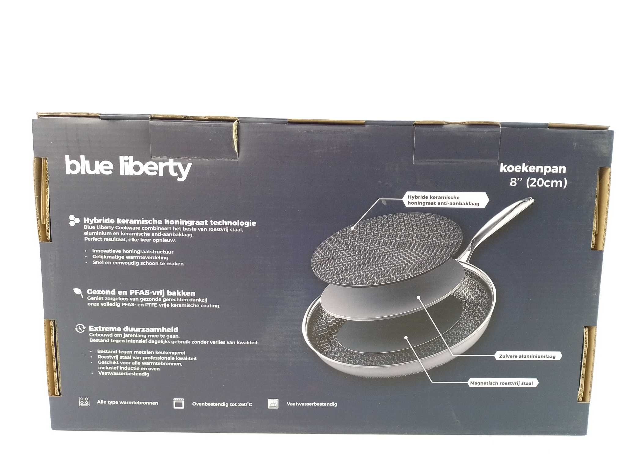 Blue Liberty Koekenpan 20cm - Zwart. De Blue Liberty koekenpan 20 cm combineert RVS met een keramische, PFAS-vrije hybride honingraatlaag voor duurzaam, krasbestendig bakken. De tri-ply bodem zorgt voor snelle, gelijkmatige warmteverdeling. Geschikt voor