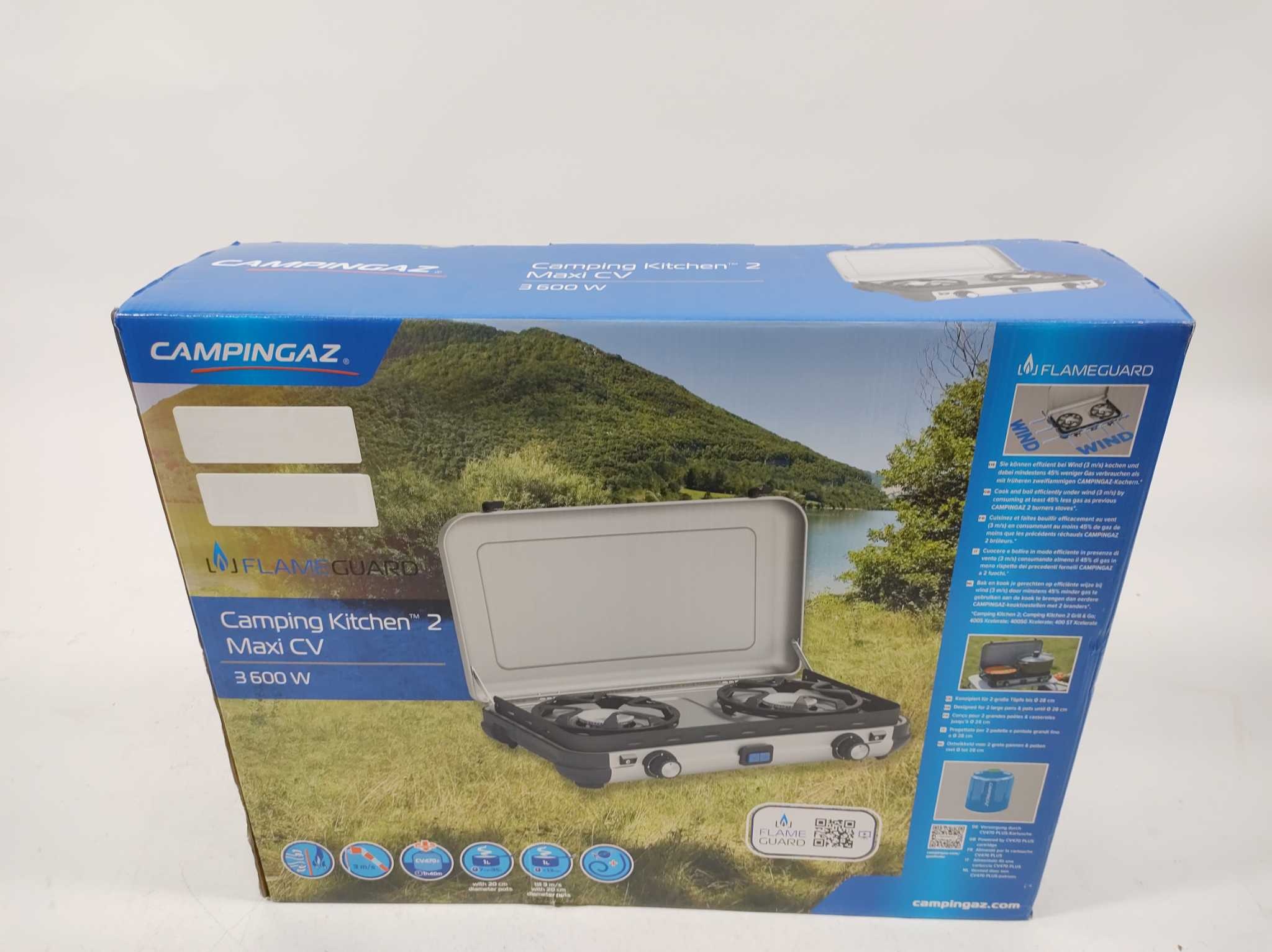 Campingaz Kooktoestel Maxi CV - 2-pits. Campingaz Camping Kitchen 2 Maxi CV is een compact 2-pits campingkooktoestel voor snelle en comfortabele buitenmaaltijden. De twee afzonderlijk regelbare branders van 1800 watt bieden samen 3600 watt vermogen, ideaal voor gelijktijdig koken. Dankzij FlameGuard kook je ook bij wind efficiënt, terwijl de grote pannendragers geschikt zijn voor pannen tot 28 cm. Piezo-ontsteking zorgt voor eenvoudig aansteken en de afneembare pannendragers maken schoonmaken extra makkelijk. Perfect voor camping, picknick of festival, met stevige deksel voor veilig transport en opslag onderweg.