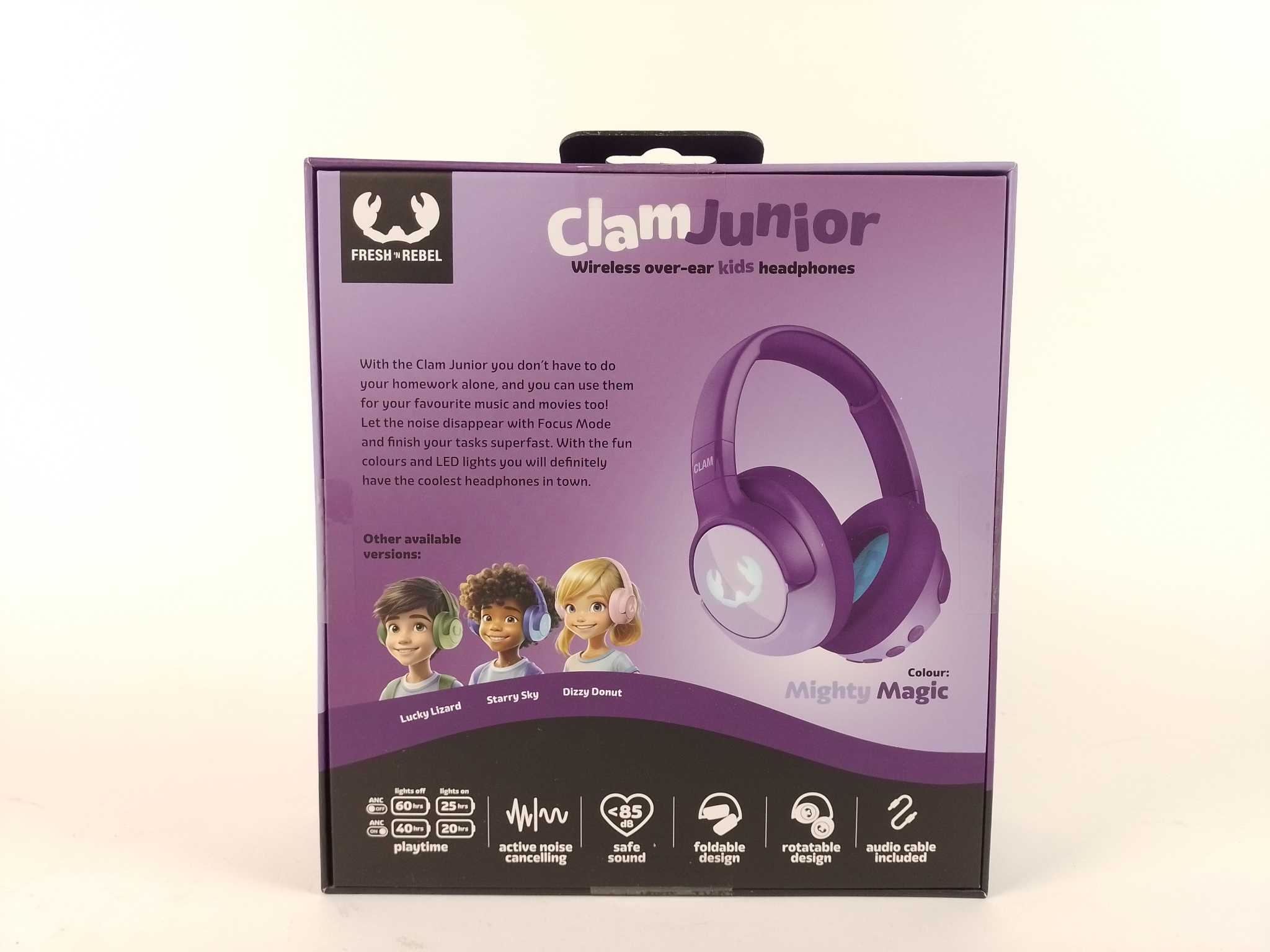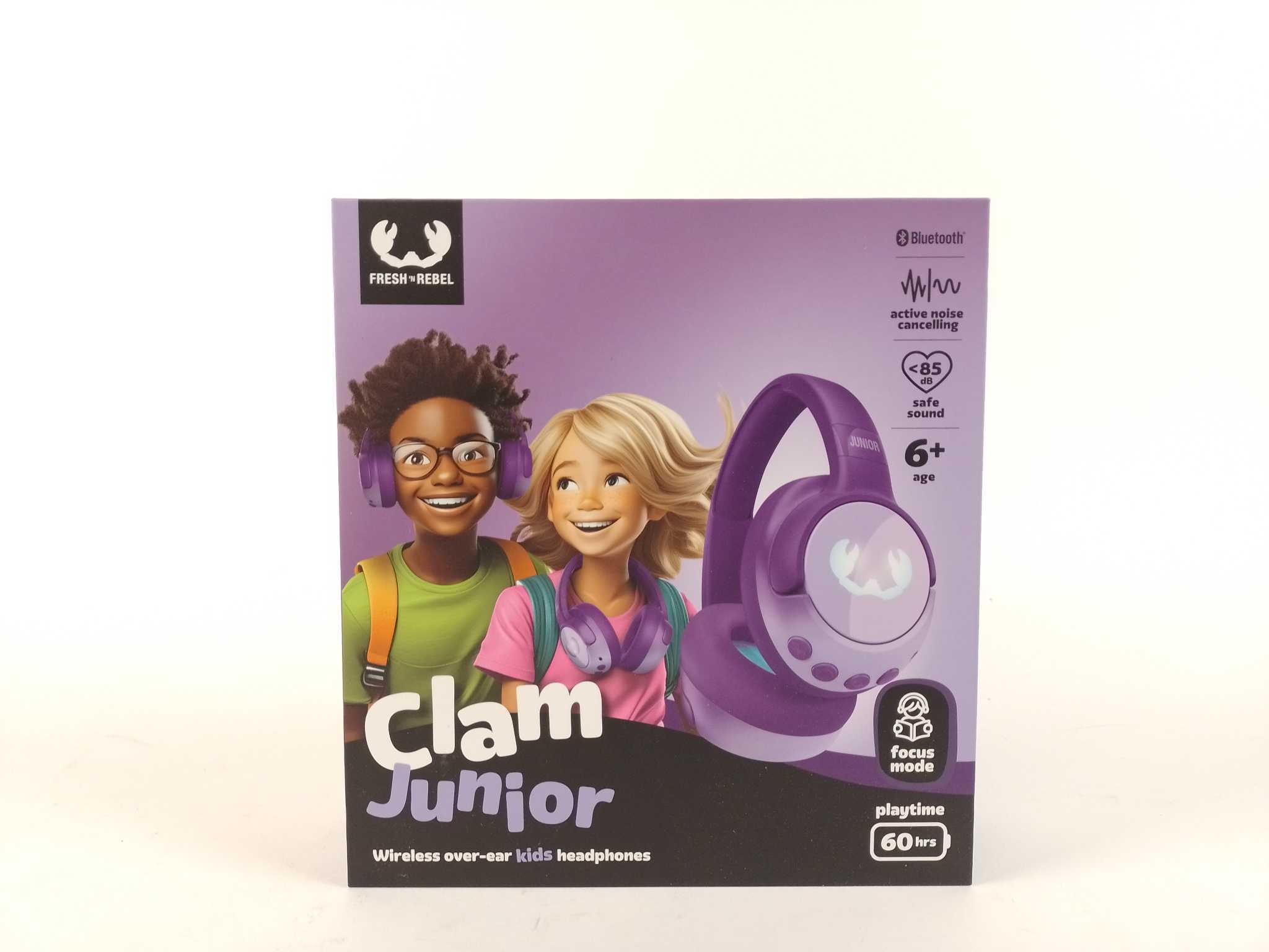 Fresh 'n Rebel Koptelefoon Clam Junior - Paars. Laat kinderen veilig genieten van muziek met de Fresh 'n Rebel Clam Junior draadloze kinderhoofdtelefoon in Mighty Magic. Safe Sound begrenst het volume tot 85 dB, terwijl Focus Mode met actieve noise cancel