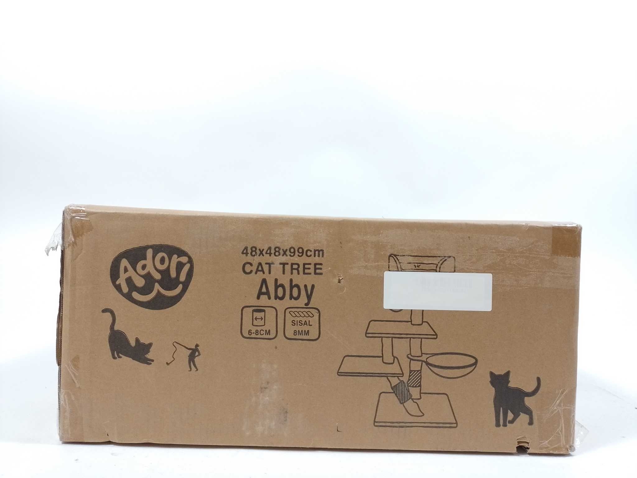 Adori Krabpaal Abby - 48x48x99 cm - Bruin/Wit. Geef je kat een eigen speel- en rustplek met de Adori Krabpaal Abby. Deze stijlvolle kattenboom (48x48 cm, ca. 99 cm hoog) heeft houten stammen, zachte pluche bekleding en stevig sisaltouw voor gezond krabgedrag. Vier niveaus met ruime plateaus en een comfortabele hangmat nodigen uit tot klimmen, spelen en dutten. De stabiele constructie helpt je meubels beschermen tegen krassen. Geschikt voor kittens en volwassen katten. Geen extra accessoires meegeleverd. Bruin-witte kleuren passen in elk interieur en zijn makkelijk te onderhouden.