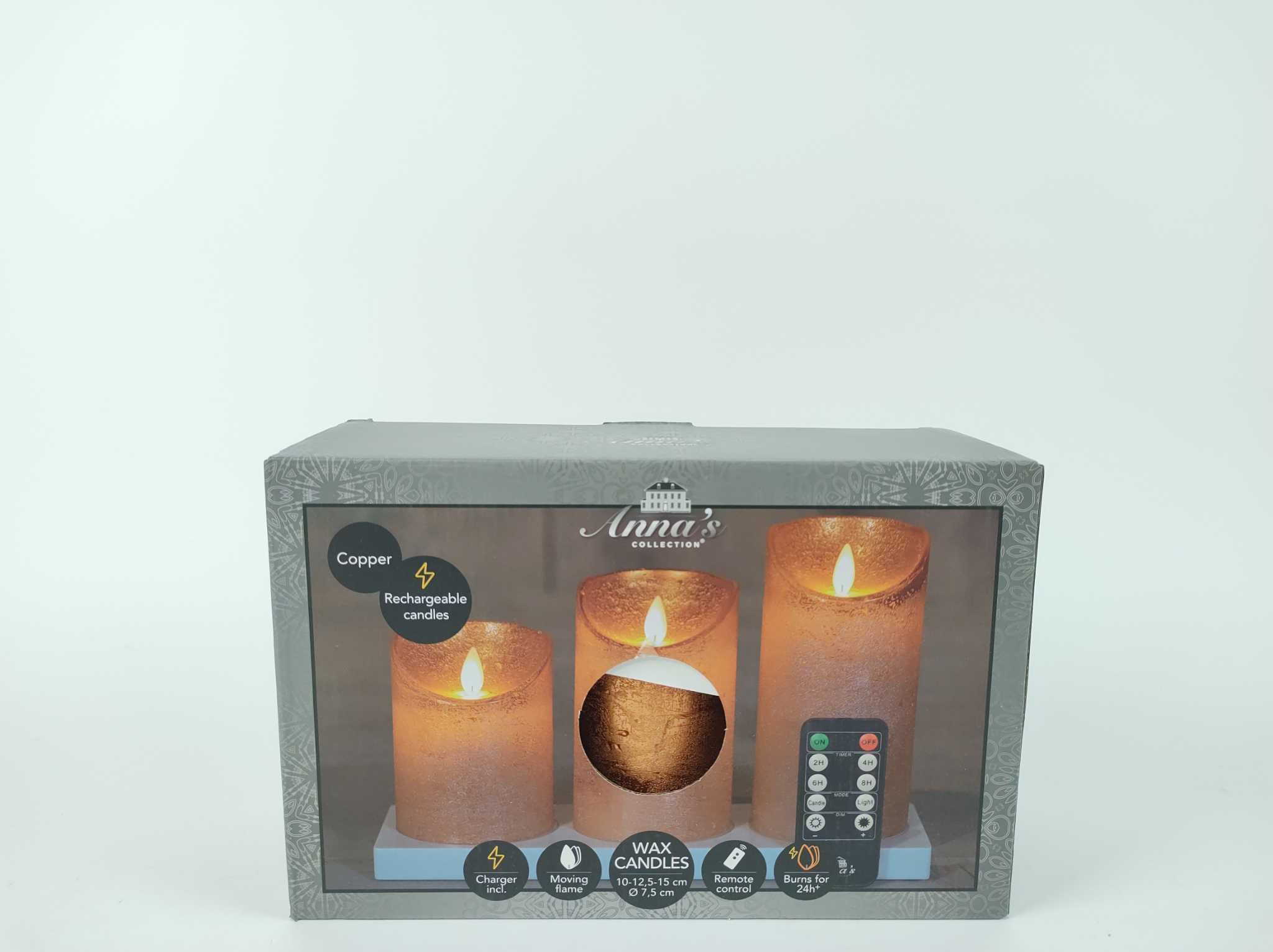 Anna's Collection LED Kaarsenset - 3 stuks. Creëer direct sfeer met de Anna’s Collection oplaadbare LED stompkaarsen in rustiek koper. Deze set van 3 kaarsen (10, 12,5 en 15 cm) heeft echte wax, een realistische bewegende vlam en instelbare lichtsterkte.