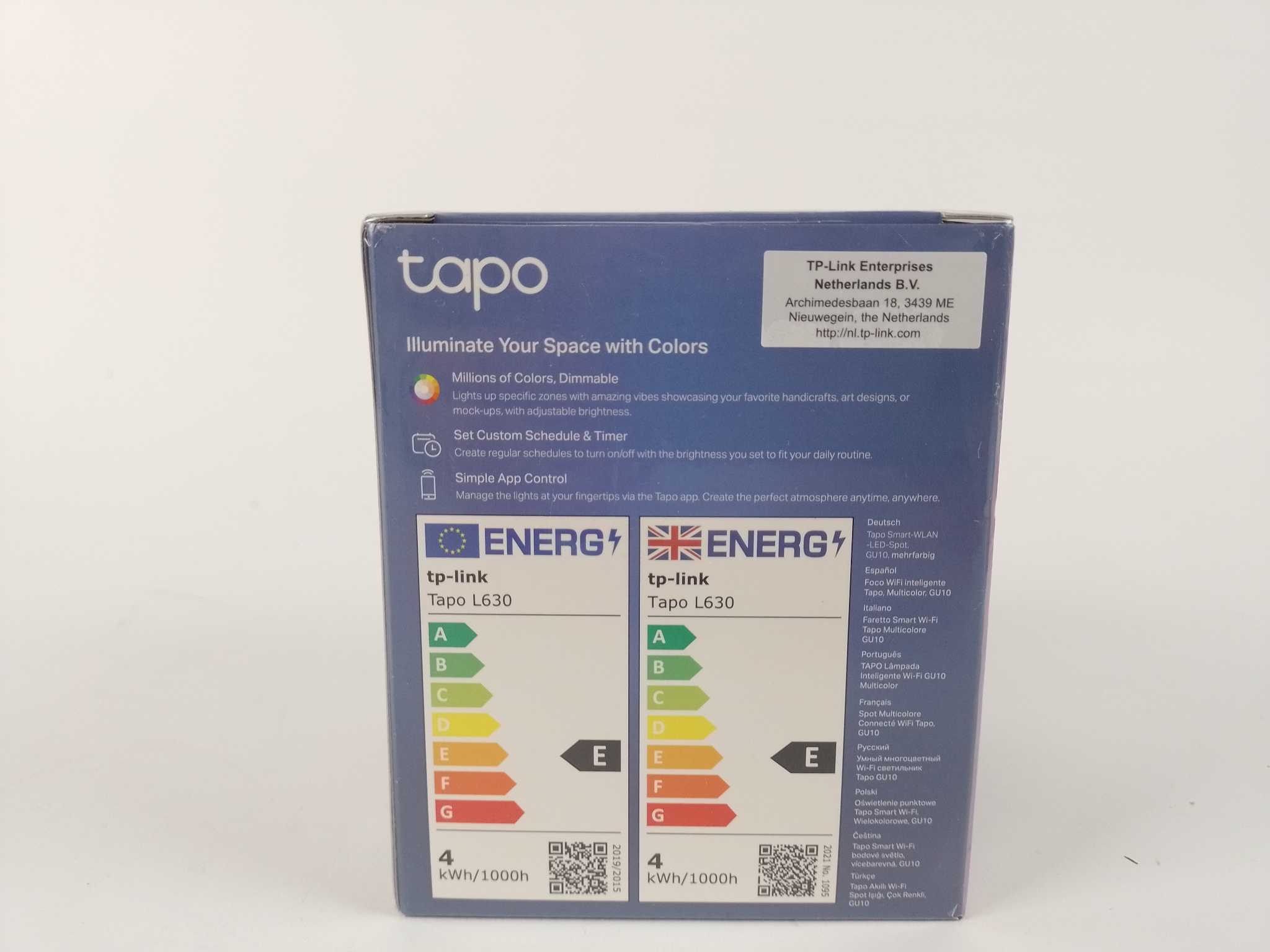 TP-Link LED Spot L630 - Multicolor - 4-pack. TP-Link Tapo L630 GU10 smart spotjes (4-pack) geven 16 miljoen kleuren en instelbaar wit (2200–6500K) met 350 lumen per lamp. Bedien via wifi, app en spraak, zonder hub. Maak scènes, routines, timers en zonsopk