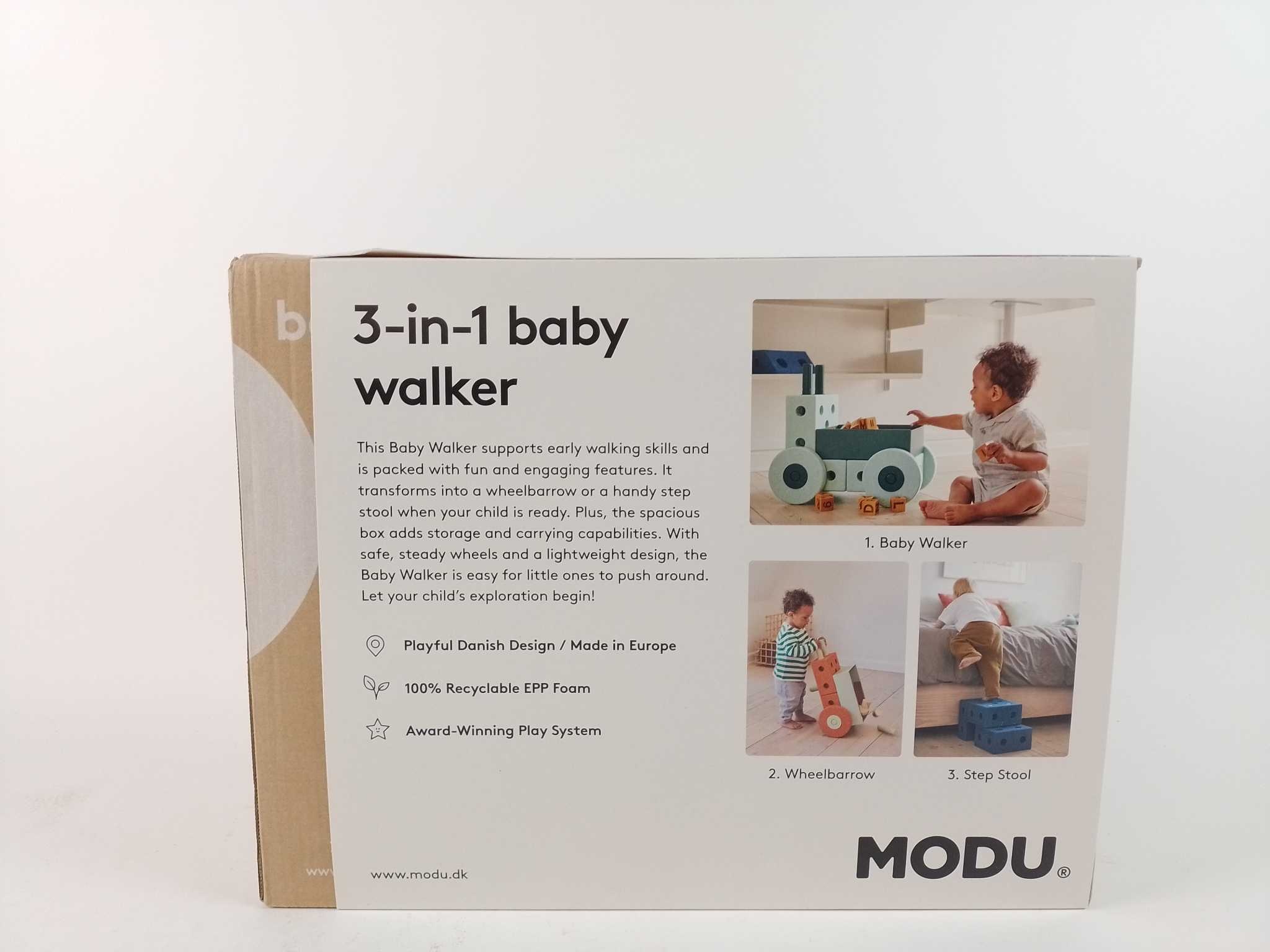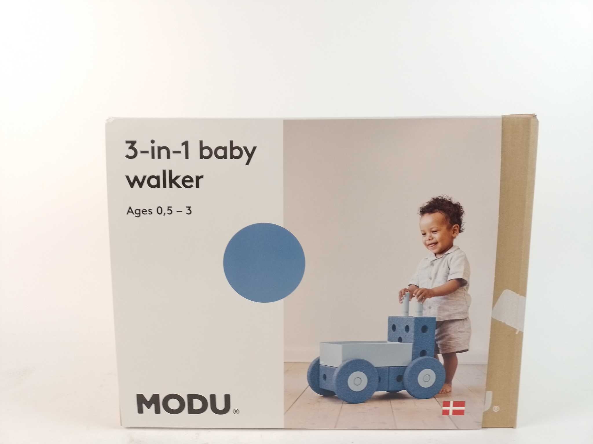 Modu Loopwagen 3-in-1 - Blauw. De Modu 3-in-1 Baby Walker is een slimme baby loopwagen en looptrainer die meegroeit. Ondersteun de eerste stapjes met stabiele, licht rollende wielen en een grote bak voor speelgoed. Bouw hem later om tot kruiwagen of stevig opstapje voor de wastafel. De zachte, duurzame EPP-foam blokken zijn licht, stil en makkelijk schoon te maken. Inclusief 3 blokken, 4 wielen, 10 verbindingspinnen en opbergdoos. Open-ended speelgoed vanaf circa 6 maanden: stimuleert balans, motoriek en fantasie, voor zelfstandig spelen in huis veilig.