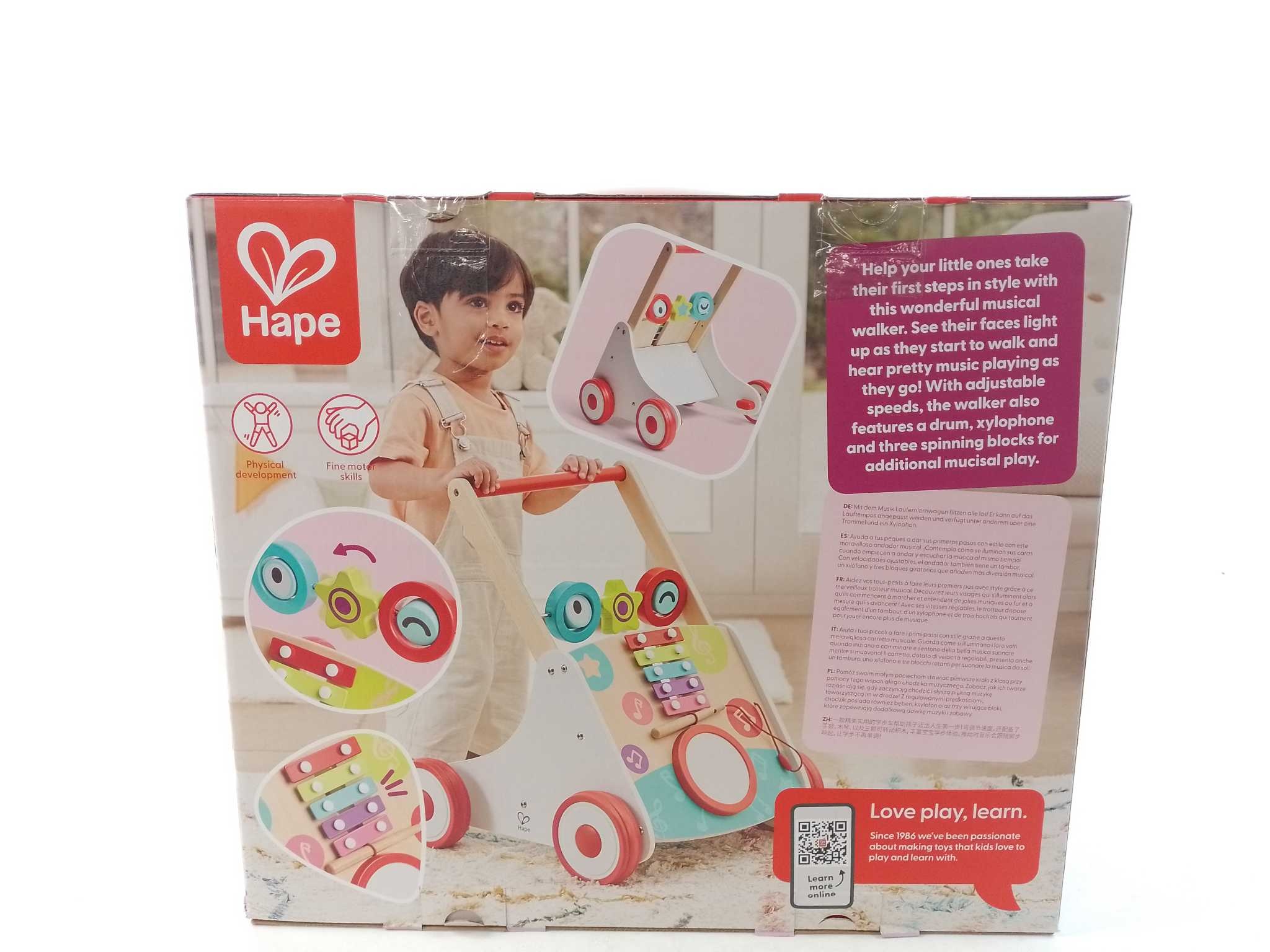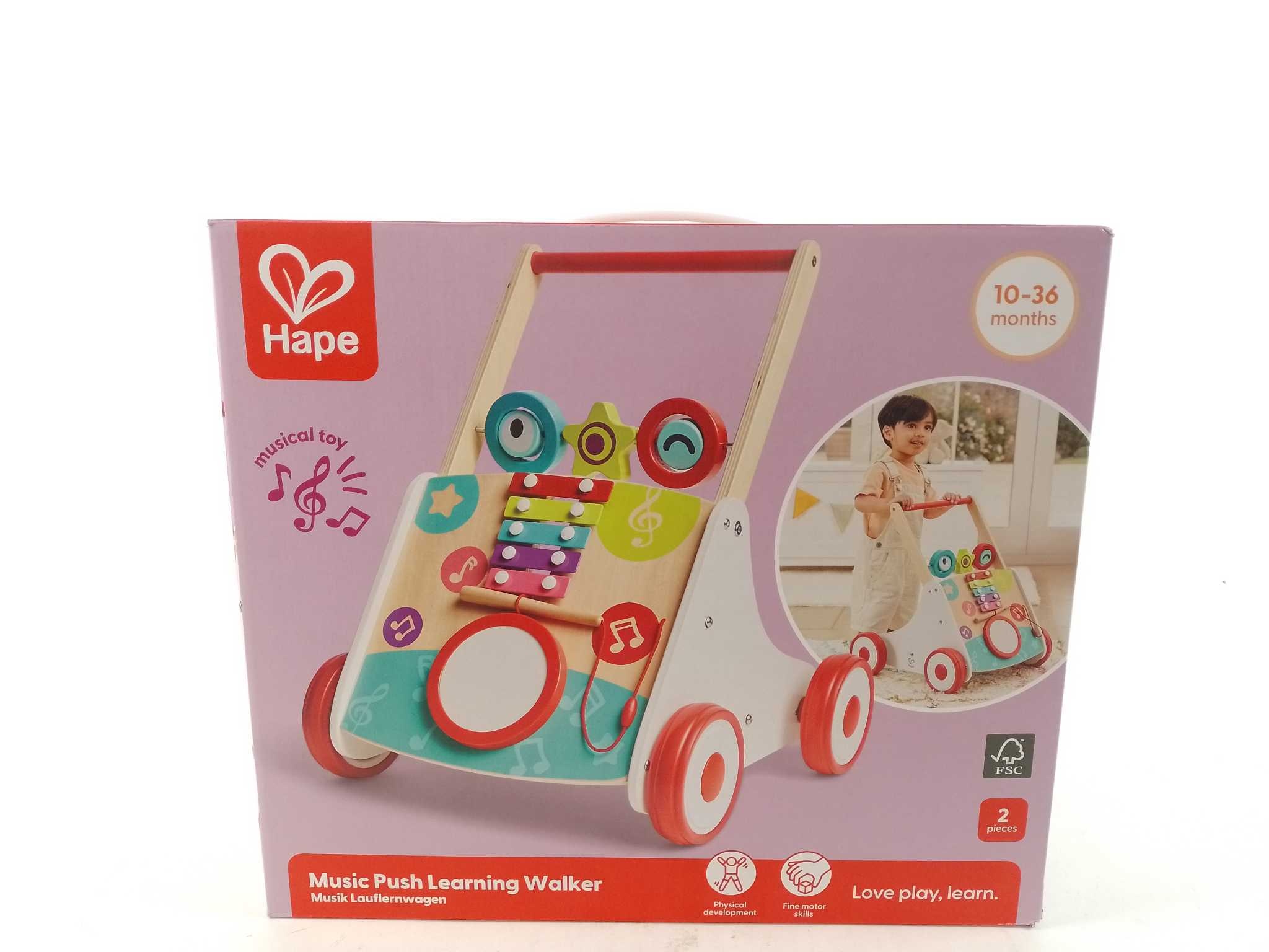 Hape Loopwagen. Met de Hape Mijn Eerste Muzikale Loopwagen worden eerste stapjes een feestje. De ingebouwde muziekdoos speelt vrolijke melodieën zodra je kindje duwt en kan ook uit voor stil gebruik. Dankzij de verstelbare snelheid groeit de looptrainer m