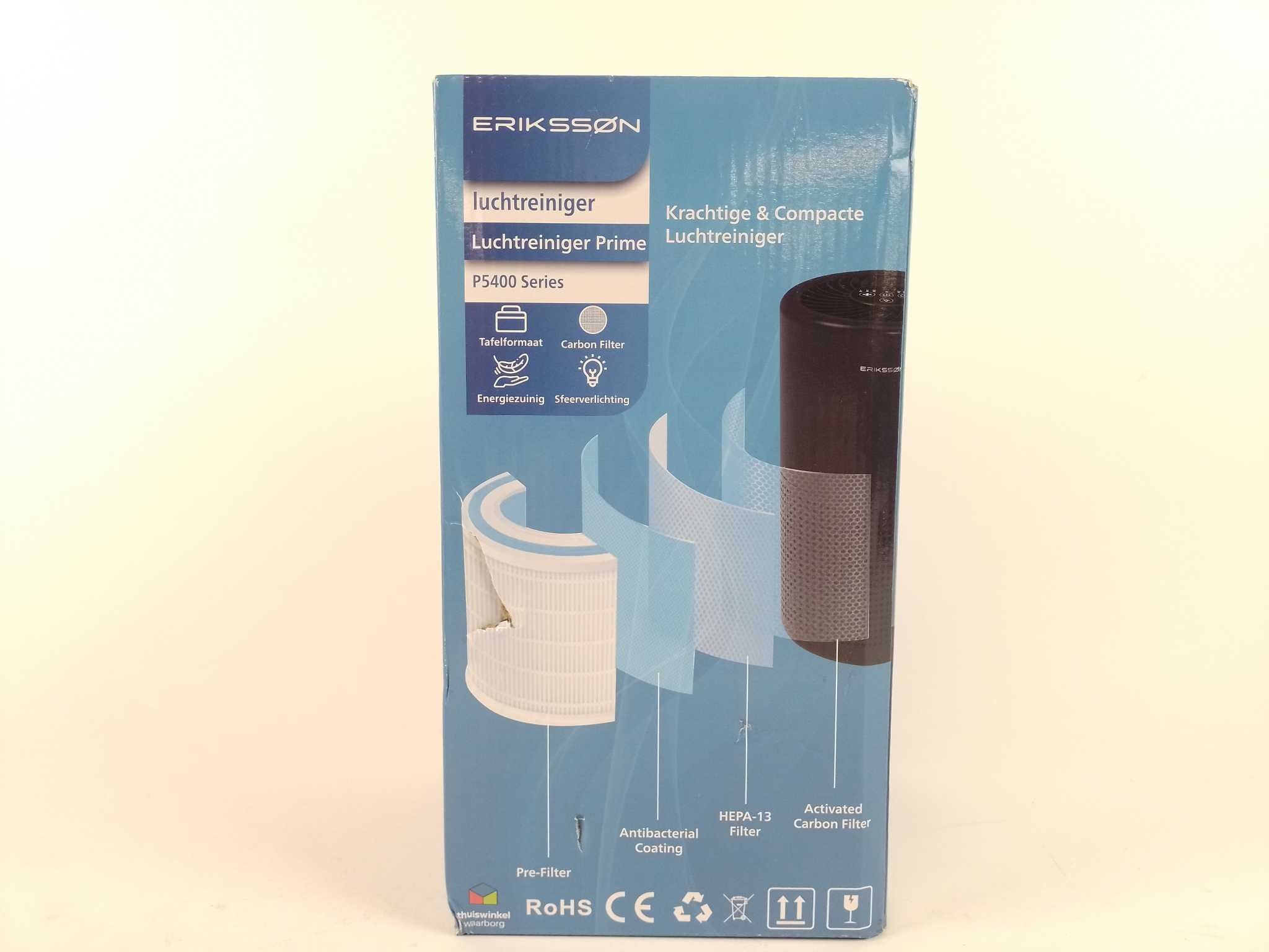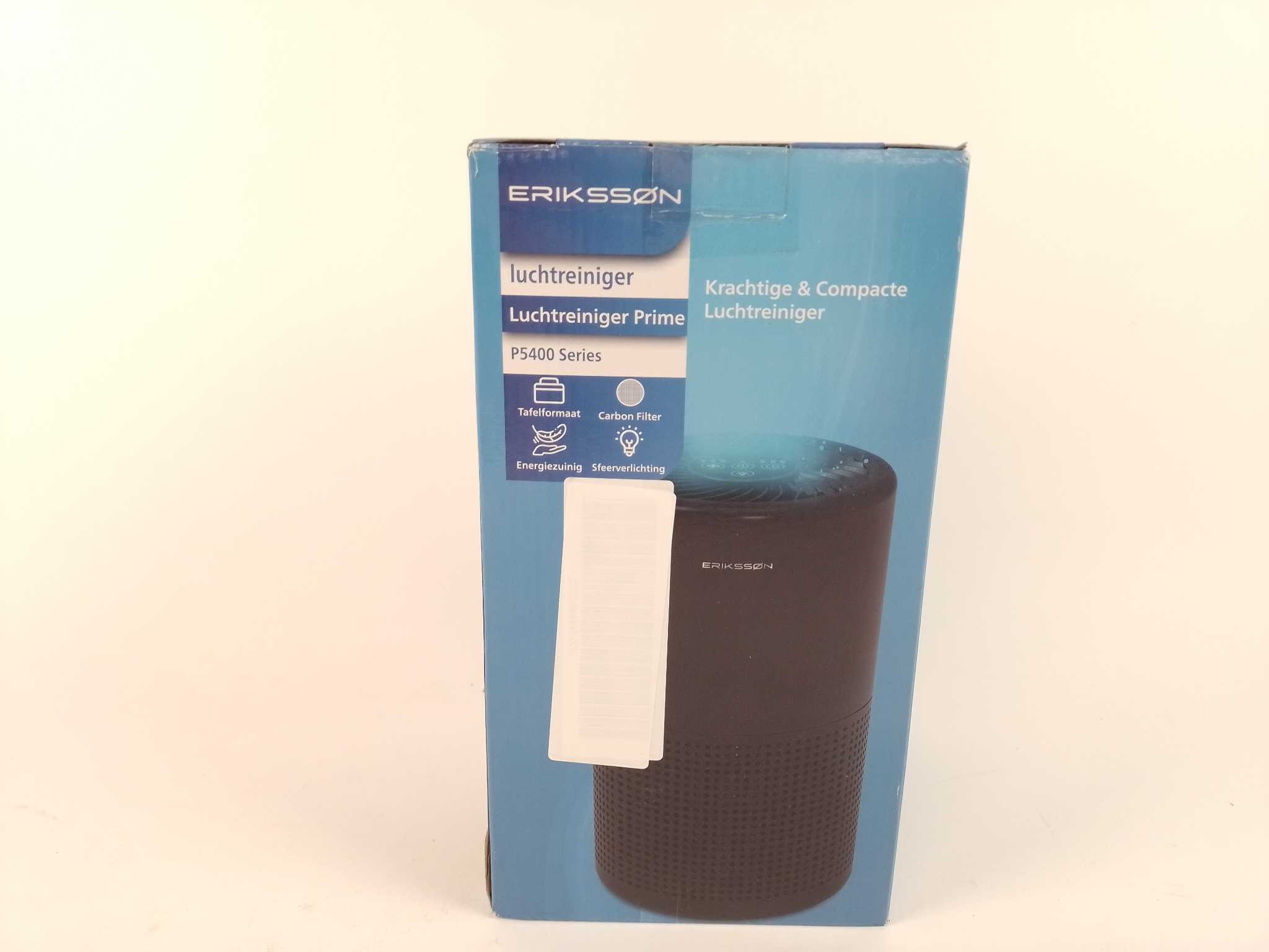 Erikssøn Luchtreiniger Prime - Zwart. Adem weer vrij met de Erikssøn Luchtreiniger Prime. Dit compacte tafelmodel zuivert tot 70 m³ per uur en reinigt een kamer in ongeveer 15 minuten. Het 3-traps HEPA-13 filter met koolstoffilter vangt 99,97% fijnstof, pollen, huisstofmijt, bacteriën en nare geurtjes. Kies uit 3 snelheden, gebruik de timer en geniet van stille werking tot 40 dB en 360° airflow met sfeerverlichting. Energiezuinig met 6W en touchdisplay; ideaal voor slaapkamer of thuiskantoor, zodat je altijd schoner ademt. Inclusief HEPA-filter, adapter en handleiding.