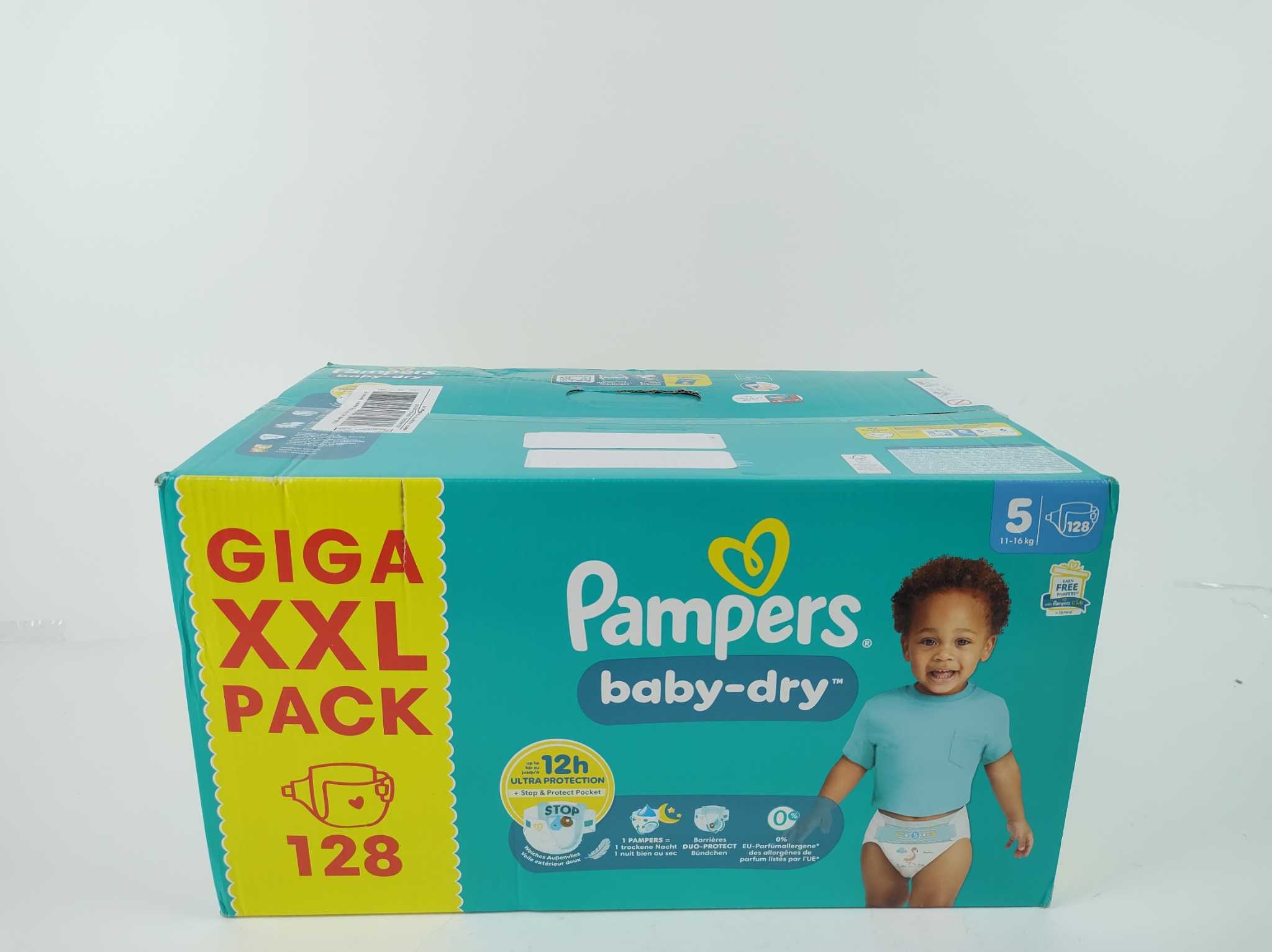 Pampers Luiers Baby Dry - Maat 5 - 128 stuks. De Pampers Baby-Dry luiers maat 5 zijn ideaal voor baby’s van 11 tot 16 kg en bieden langdurige droogheid en betrouwbare bescherming, ook ’s nachts. Dit giga pack bevat 128 luiers en is perfect voor dagelijks gebruik. Dankzij het verbeterde absorptievermogen wordt vocht snel vastgehouden, terwijl de Stop & Protect pocket helpt lekken aan de achterkant te voorkomen. De zachte ComfortTouch-buitenlaag en flexibele pasvorm zorgen voor extra zacht comfort bij iedere beweging, thuis en onderweg, elke dag opnieuw zonder zorgen.