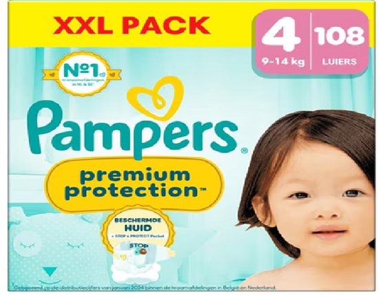 Pampers Luiers Premium Protection - Maat 4 - 108 stuks. Pampers Premium Protection maat 4 (9–14 kg) biedt superieure dubbele bescherming dankzij onmiddellijke absorptie én de innovatieve Stop & Protect-pockets tegen lekken. Gemaakt van ademende microporiën voor een droge, gezonde babyhuid. Dermatologisch goedgekeurd en parfumvrij volgens EU-normen. De luxe XXL‑verpakking bevat 108 luiers, ideaal voor gezinnen met intensief gebruik. Dankzij elastische taille en zachte pasvorm blijft de luier stevig zitten, zelfs bij actieve kleintjes.
