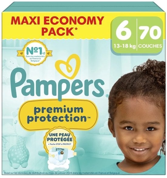 Pampers Luiers Premium Protection - Maat 6 - 70 stuks. De Pampers Premium Protection luiers maat 6 zijn ideaal voor baby’s van 13 tot 18 kg en bieden zacht comfort en betrouwbare lekbescherming, dag en nacht. Dit maxi pack bevat 70 luiers en is perfect voor dagelijks gebruik. Dankzij de absorberende microporiën wordt vocht snel van de huid weggehouden, terwijl de Stop & Protect Pocket extra bescherming aan de achterkant geeft. De ademende, ultrazachte materialen ondersteunen de gevoelige babyhuid en zorgen voor een comfortabele pasvorm bij elke verschoonbeurt thuis opnieuw.