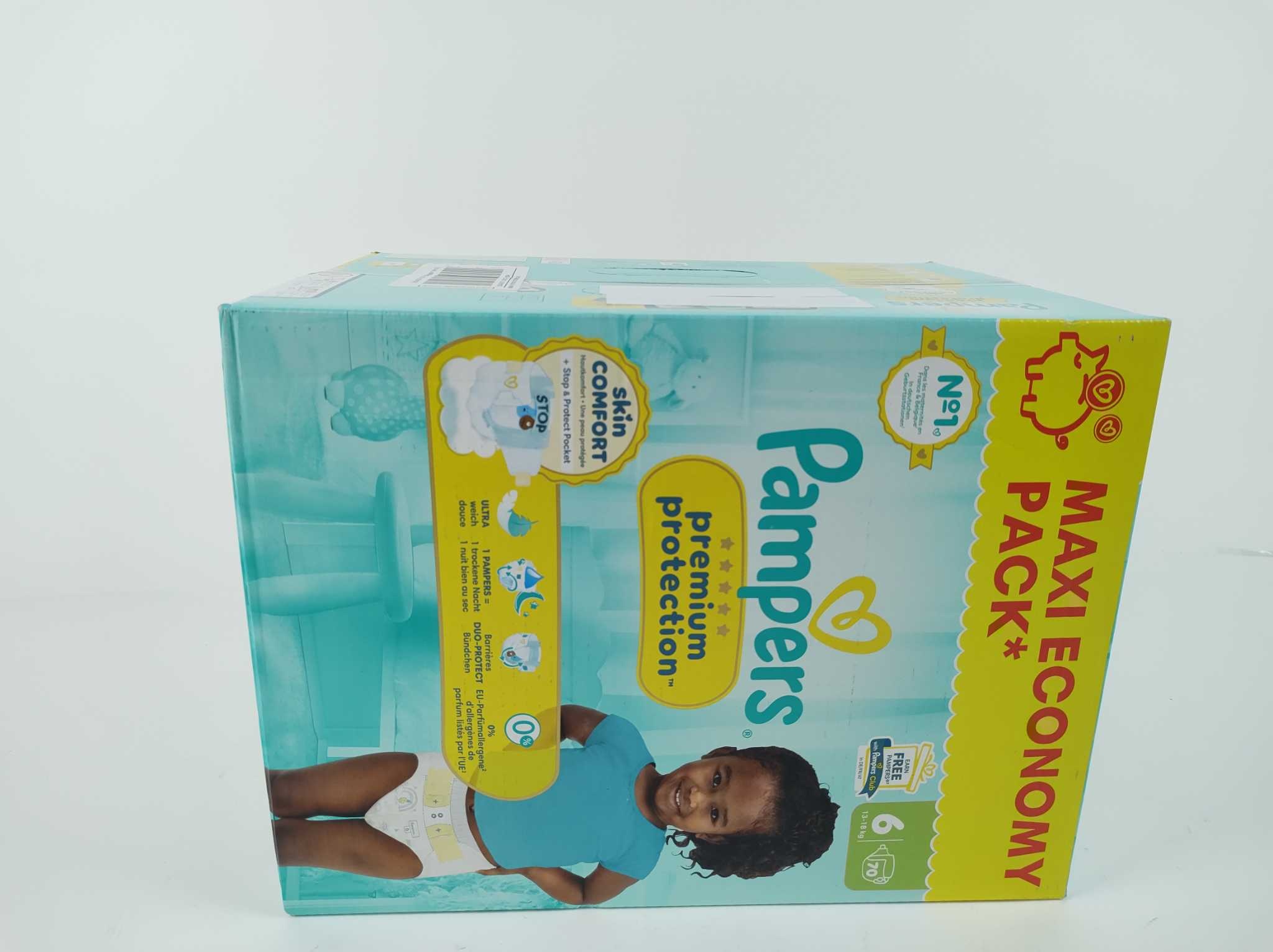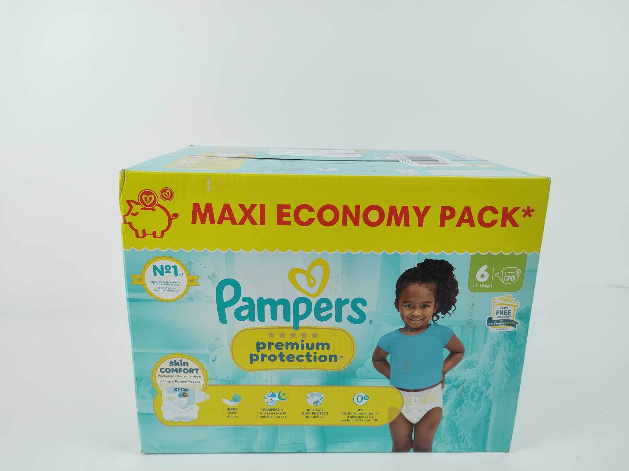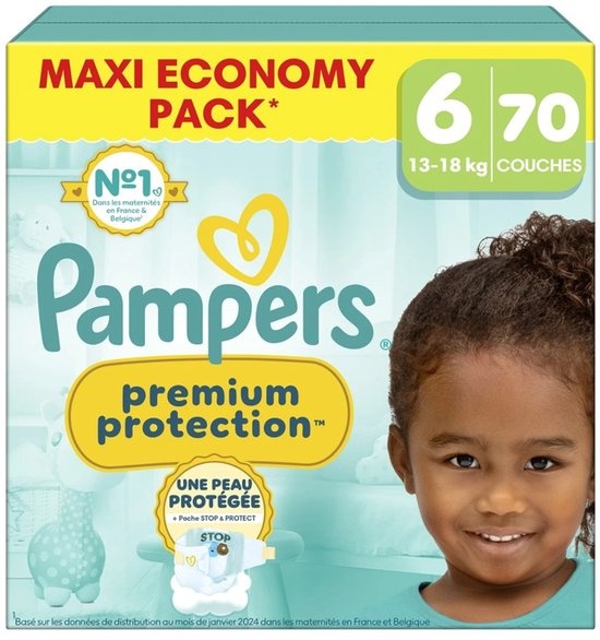 Pampers Luiers Premium Protection - Maat 6 - 70 stuks. De Pampers Premium Protection luiers maat 6 zijn ideaal voor baby’s van 13 tot 18 kg en bieden zacht comfort en betrouwbare lekbescherming, dag en nacht. Dit maxi pack bevat 70 luiers en is perfect vo