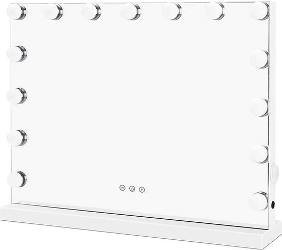 Bright Beauty Vanity Make-Up Spiegel Hollywood - 58x43 cm. De Bright Beauty Vanity Hollywood make-up spiegel biedt perfecte verlichting met drie instelbare lichtstanden. Het randloze design geeft een luxe uitstraling, terwijl de LED-verlichting zorgt voor optimale zichtbaarheid. Met afmetingen van 58 x 43 cm is deze spiegel ideaal voor nauwkeurige make-up en hairstyling. Drie lichtstanden. Kleur: Wit. Diameter: 40 cm. Kleur: wit. Materiaal: Aluminium | Glas. Voor binnen of buiten: Voor binnen. Vorm: Rechthoek. Stijl: Modern. Product breedte: 58 cm.