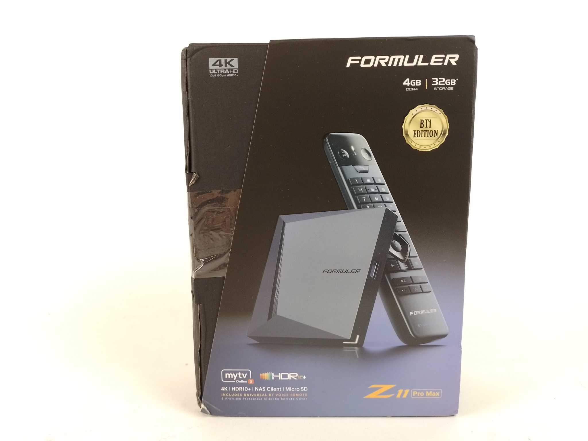Formuler Mediaspeler Z11 Pro Max. De Formuler Z11 Pro Max BT Edition is een razendsnelle 4K IPTV-box mediaspeler met Android 11 en MyTVOnline 3. Dankzij 4GB DDR4 en 32GB opslag start apps vlot, terwijl WiFi 6, dual-band en gigabit LAN voor stabiele streams zorgen. Geniet van HDR10+ beeld en soepel 60 fps met AV1. In de doos: mediaspeler, BT1 Bluetooth afstandsbediening met cover, HDMI-kabel, adapter, batterijen en handleiding. Sluit extra opslag aan via USB 3.0 of microSD en gebruik de optische audio-uitgang voor je soundbar.