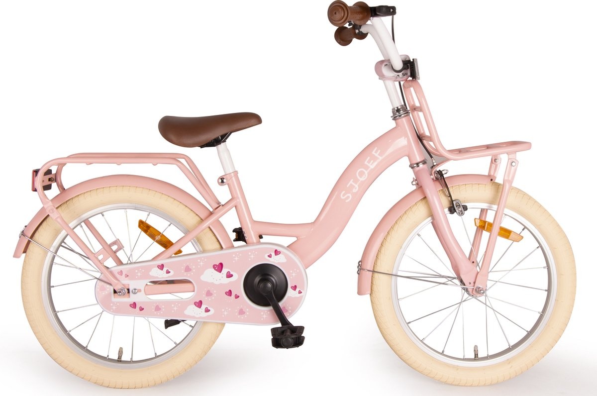Sjoef Meisjesfiets Classic - 18 Inch - Roze. De Sjoef Classic meisjesfiets 18 inch in roze is een stijlvolle kinderfiets voor meisjes van 5 tot 7 jaar. Deze fiets biedt veilig rijcomfort dankzij een handrem voor, terugtraprem achter, reflectoren, gesloten kettingkast en stevige aluminium velgen. Het verstelbare zadel en stuur groeien mee voor extra gebruiksgemak. Inclusief bel, zijstandaard, stootkussen op het stuur en montagemateriaal. Bovendien wordt de fiets voor 95% afgemonteerd geleverd, zodat hij snel rijklaar is. Ideaal voor dagelijks gebruik, schoolritten en vrolijke ritjes door de buurt.