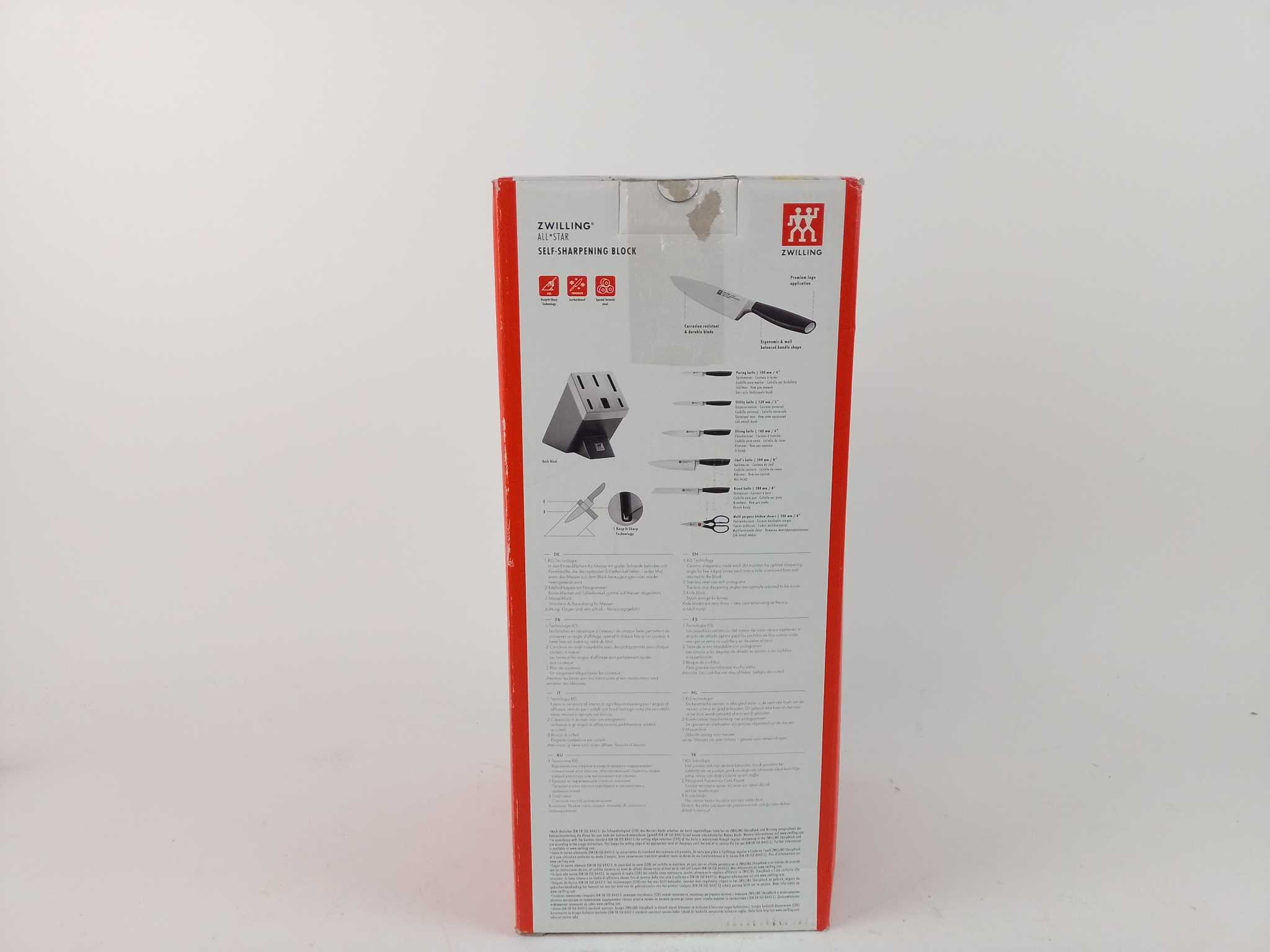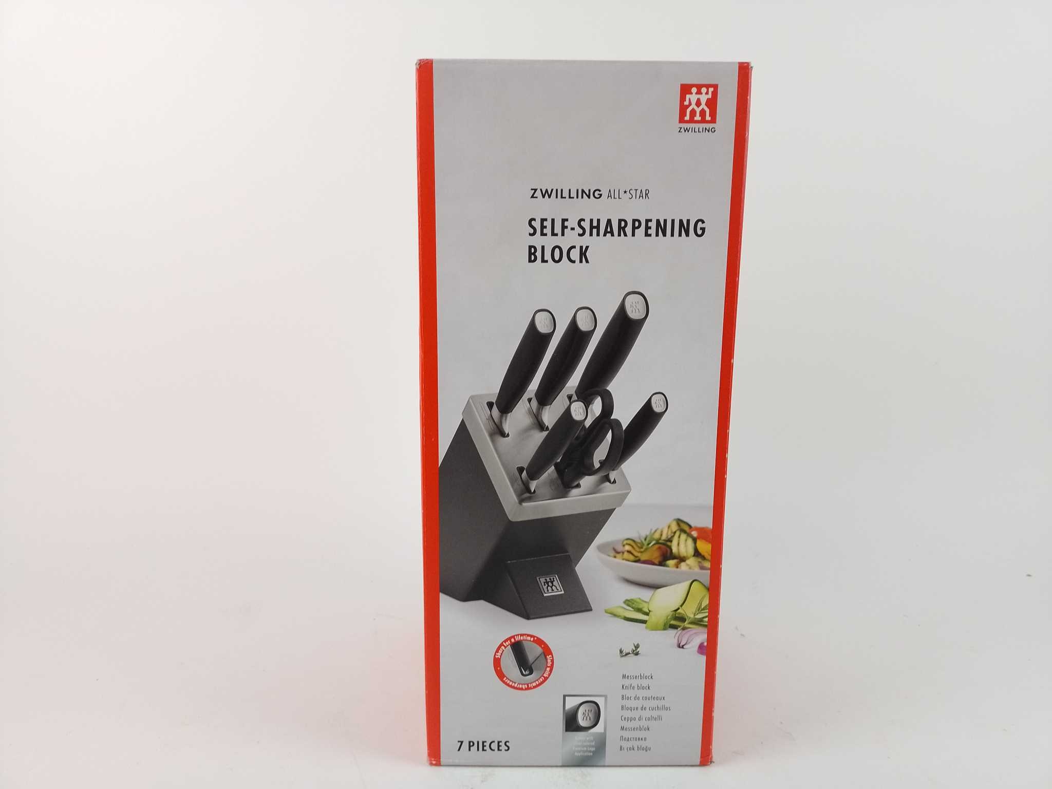 Zwilling Messenblok All Star - 7-delig. Het Zwilling All Star zelfslijpende messenblok met slijpfunctie is de complete messenset voor elke keuken. In de sleuven zitten keramische slijpstenen, zodat je messen scherp blijven bij elke keer pakken en terugzet