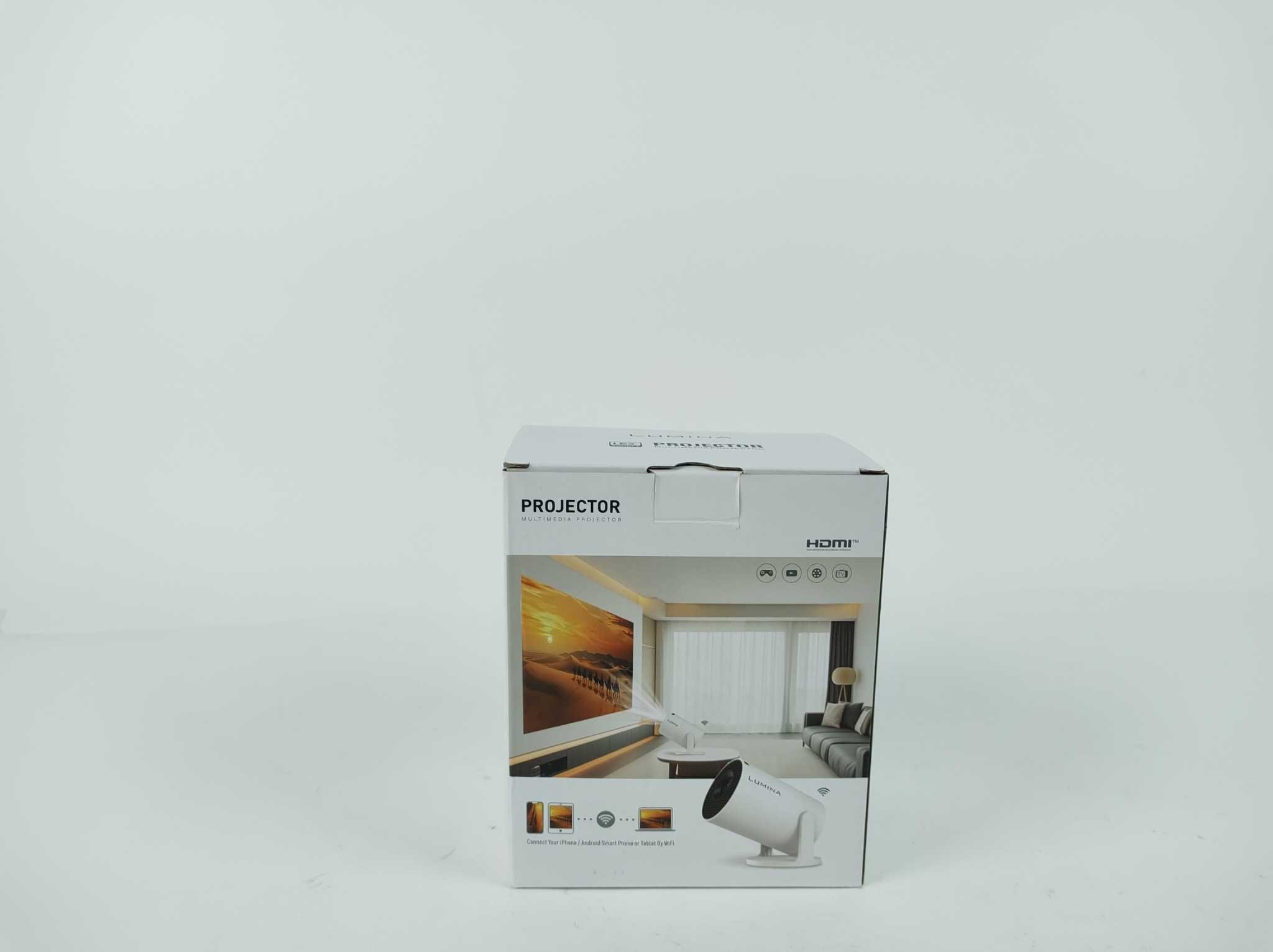 Lumina Mini Beamer Pro - Wit. Met de Lumina Pro Mini Beamer 2025 maak je van elke kamer een thuisbioscoop. De compacte projector projecteert helder met 250 ANSI en ondersteunt 4K-invoer voor scherpe films en presentaties. Dankzij Android 14 stream je apps direct, terwijl WiFi 6 en Bluetooth 5.4 stabiel verbinden met smartphone of speaker. Automatische keystonecorrectie zet het beeld recht. HDMI- en USB-aansluiting maken koppelen eenvoudig. Meegeleverd: bluetooth afstandsbediening en HDMI-kabel. Met 1,2–4 meter projectieafstand en 50.000 uur ledlevensduur geniet je jarenlang overal zonder gedoe.