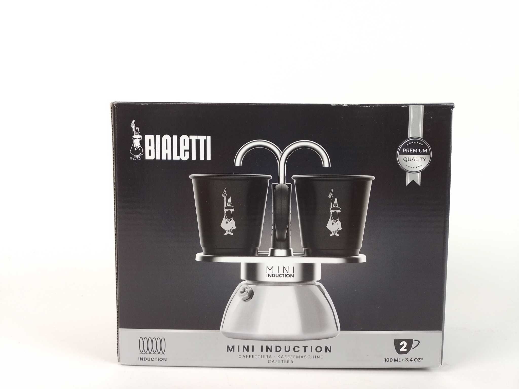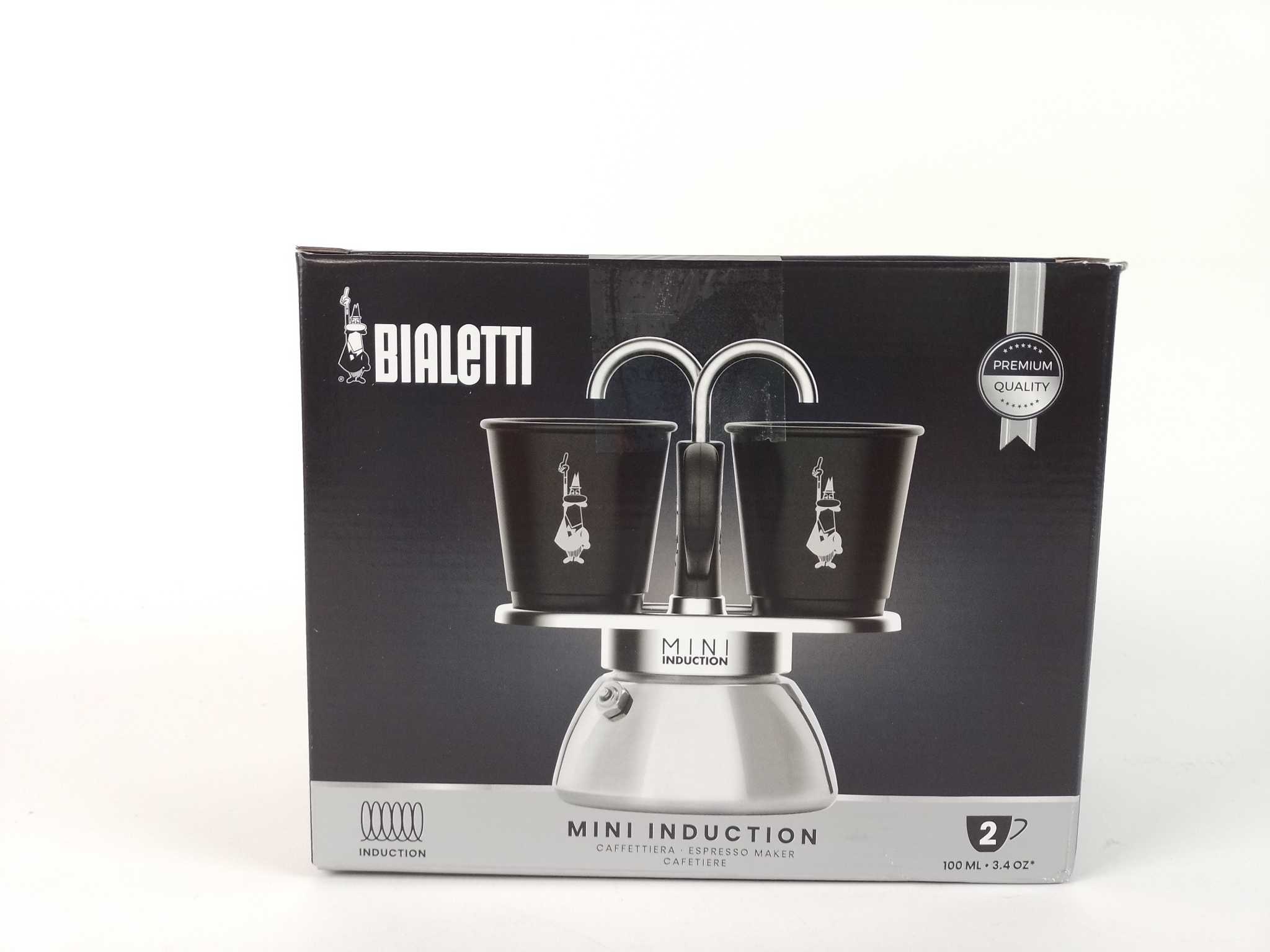 Bialetti Mini Express Induction - RVS. De Bialetti Mini Express Induction is een 2-kops espressomaker die rechtstreeks in de kopjes serveert. Dankzij de roestvrijstalen bodem werkt hij op inductie, gas, elektrisch en keramisch. De aluminium steunplaat ver