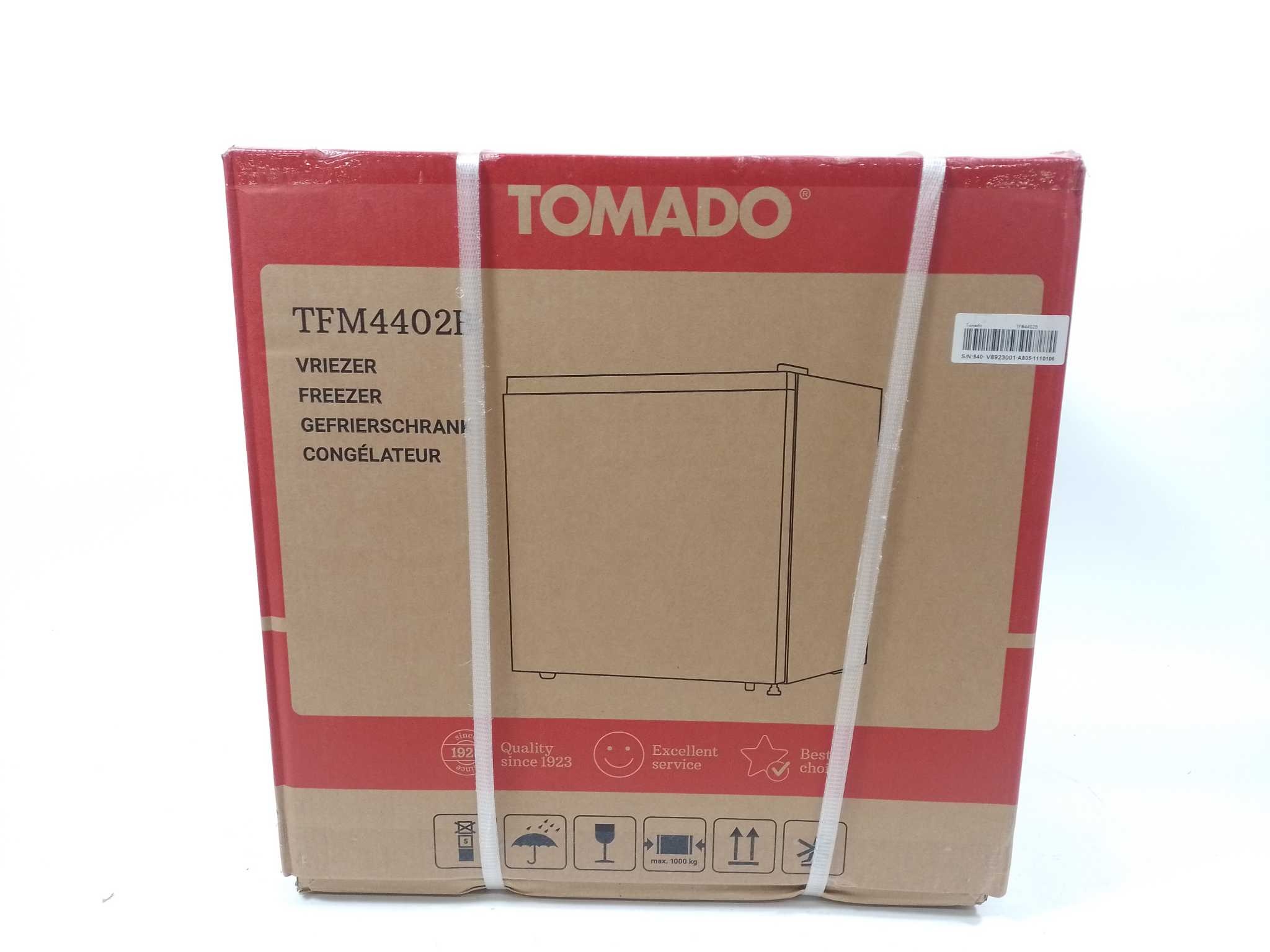 Tomado Mini Vriezer 31L - Zwart - TFM4402B. De Tomado TFM4402B mini vriezer (31 liter) biedt extra vriesruimte in compact barmodelformaat. Stil in gebruik en voorzien van regelbare thermostaat, invriesvak met handig legplateau en deurruimte. Energiezuinig