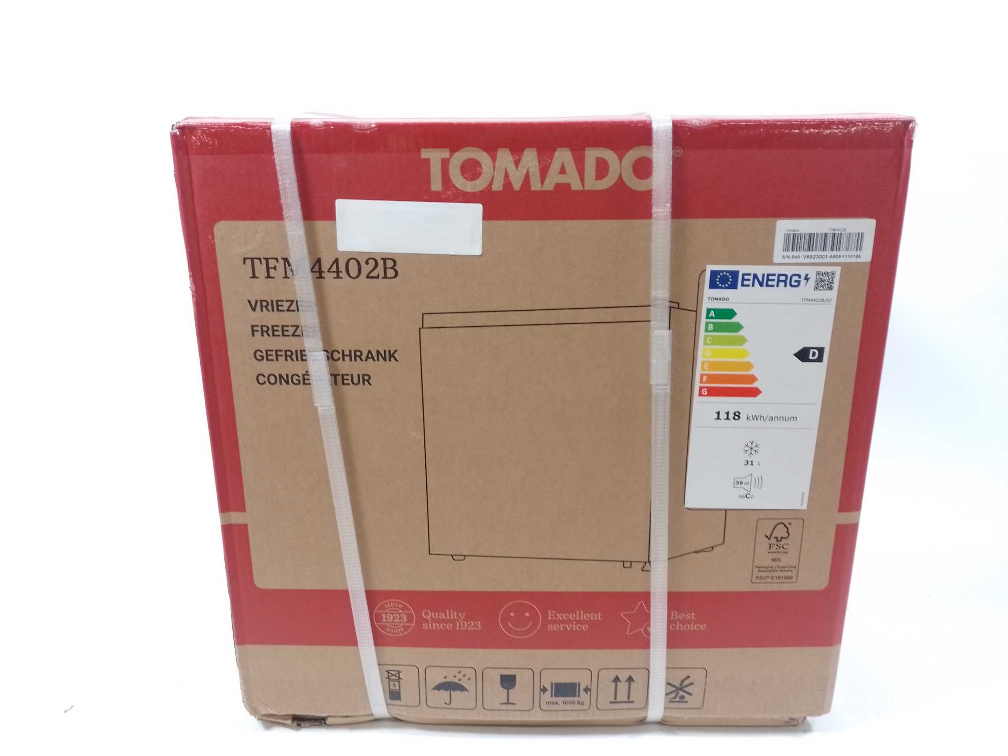 Tomado Mini Vriezer 31L - Zwart - TFM4402B. De Tomado TFM4402B mini vriezer (31 liter) biedt extra vriesruimte in compact barmodelformaat. Stil in gebruik en voorzien van regelbare thermostaat, invriesvak met handig legplateau en deurruimte. Energiezuinig ontwerp en snel te plaatsen dankzij het lichte, vrijstaande design. Ideaal voor studentenkamer, schuur of bijkeuken. Meegeleverd: ijsblokjeshouder en handleiding. Betrouwbare, betaalbare diepvriesoplossing met strak zwart design voor snacks, ijs en porties voorbereid eten. Past onder aanrecht, deur omkeerbaar voor flexibele plaatsing.