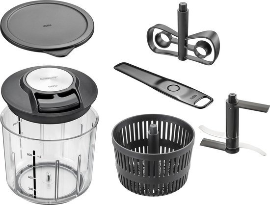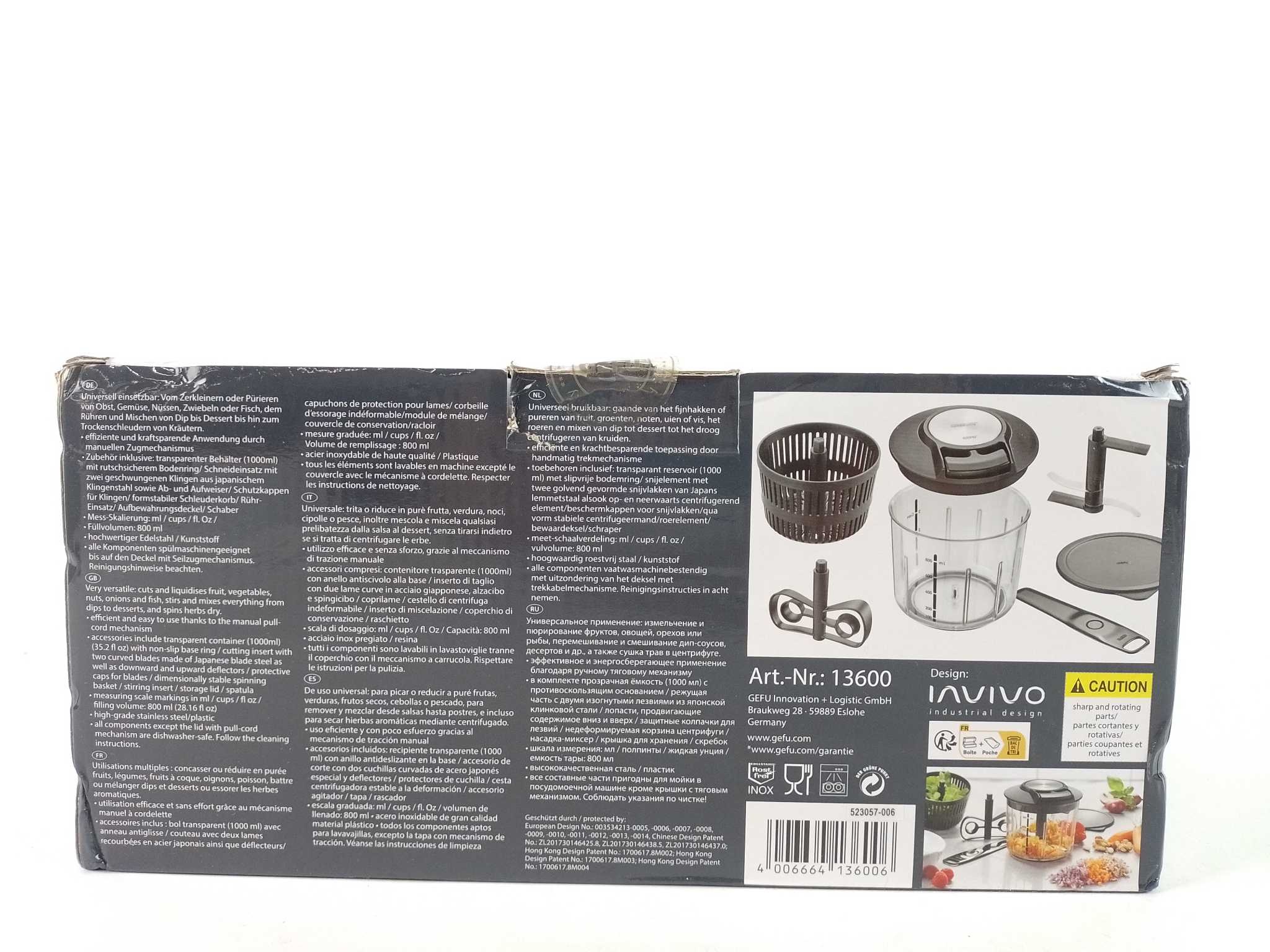 GEFU Multi-Hakmolen Speedwing. De GEFU Speedwing multi-hakmolen hakt, mengt en droogcentrifugeert zonder stroom. Het roestvrijstalen mes en trekkoordmechanisme leveren snel, gelijkmatig resultaat voor uien, noten, kruiden en dips. Grote kom van 1 liter (800 ml vulcapaciteit) met antislipbodem werkt veilig en schoon. Inclusief roerelement, centrifugeermand voor kruiden, bewaardeksel en schraper. Compact, vaatwasserbestendig en ideaal voor keuken, camper of camping. Bespaar tijd bij pesto, salsa en salades – stil, krachtig en altijd klaar voor vers koken. Met transparante kom voor controle tijdens het hakken.
