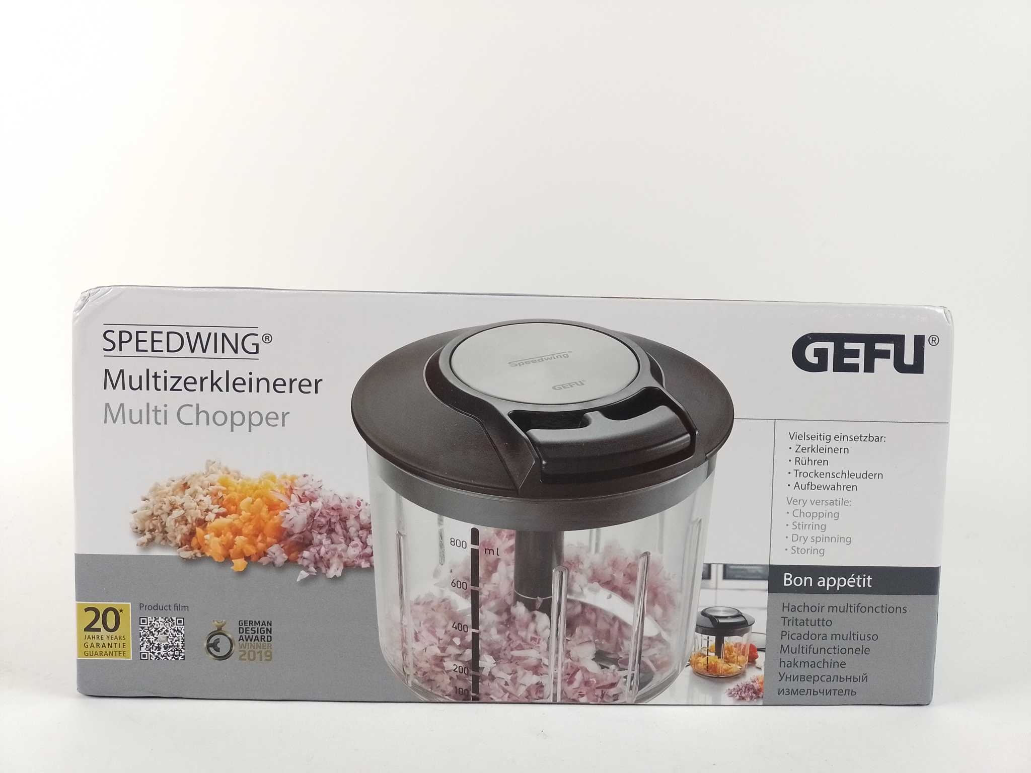 GEFU Multi-Hakmolen Speedwing. De GEFU Speedwing multi-hakmolen hakt, mengt en droogcentrifugeert zonder stroom. Het roestvrijstalen mes en trekkoordmechanisme leveren snel, gelijkmatig resultaat voor uien, noten, kruiden en dips. Grote kom van 1 liter (8