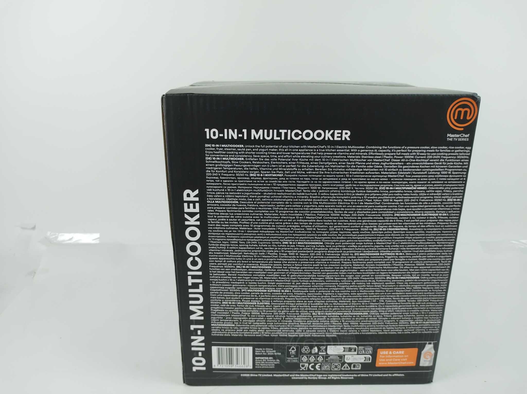 MasterChef Multicooker 10-in-1. MasterChef 10-in-1 multicooker maakt snel en veelzijdig koken eenvoudig voor elk gezin. Met een ruime inhoud van 6 liter, 10 automatische kookprogramma’s en een vermogen van 1000 watt bereid je moeiteloos rijst, soep, vlees, yoghurt en stoofgerechten. Het duidelijke LCD-display, de 24-uurs timer en automatische uitschakeling zorgen voor extra gebruiksgemak. De vaatwasserbestendige binnenpan maakt schoonmaken makkelijker. Inclusief binnenpan, rijstlepel, maatbeker en condensatieopvangbeker. Ideaal voor wie tijd wil besparen en toch smaakvolle, voedzame maaltijden op tafel wil zetten.