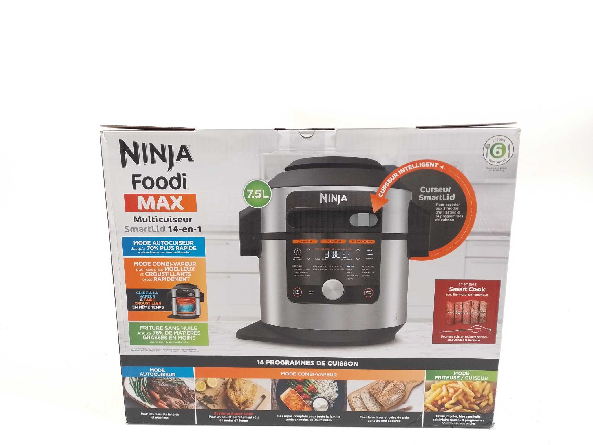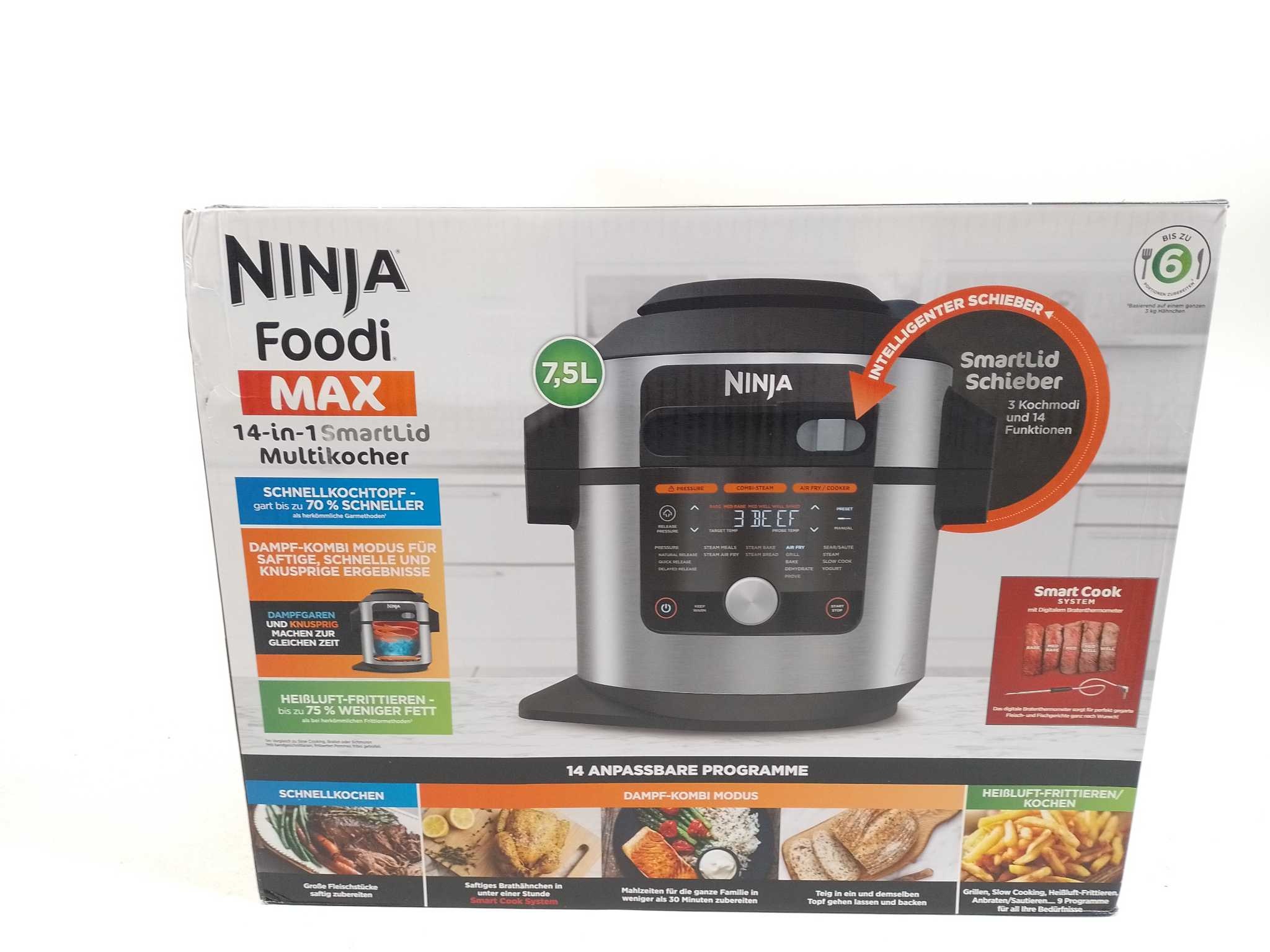 Ninja Multicooker Foodi OL750EU. De Ninja Foodi OL750EU is een 14-in-1 multicooker met 7,5 L inhoud en 1760 W vermogen, geschikt voor gezinnen tot 6 personen. Dankzij het slimme SmartLid-systeem schakel je moeiteloos tussen drukkoken, airfryen, grillen, b