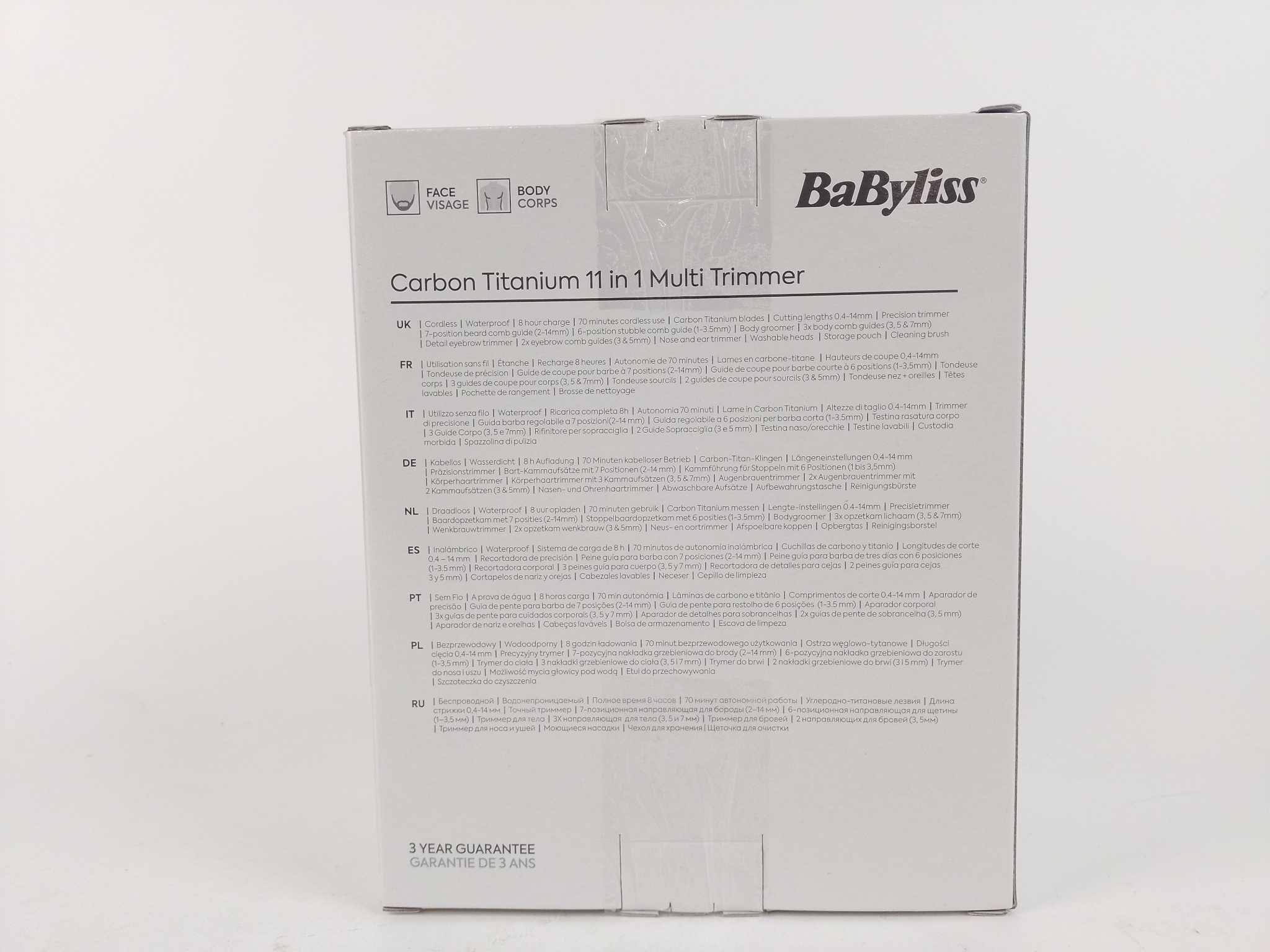 BaByliss Multigroomer 11-in-1 - MT860E. De BaByliss MT860E multigroomer is een 11-in-1 baardtrimmer en bodygroomer voor gezicht en lichaam. Waterdicht en afspoelbaar, ideaal onder de douche. Carbon titanium messen knippen soepel en precies. Gebruik snoerloos tot 70 minuten of bedraad; opladen duurt 8 uur. Trim van 1 tot 14 mm met verstelbare kammen. Inclusief baardopzetkam, drie lichaamsopzetkammen, precisietrimmer, detailtrimmer met opzetkammen, neus- en oortrimmer, reinigingsborstel, opbergetui en handleiding. Perfect voor stoppels, contouren, wenkbrauwen en lichaamsbeharing; compact mee te nemen en geeft elke dag een verzorgde look.