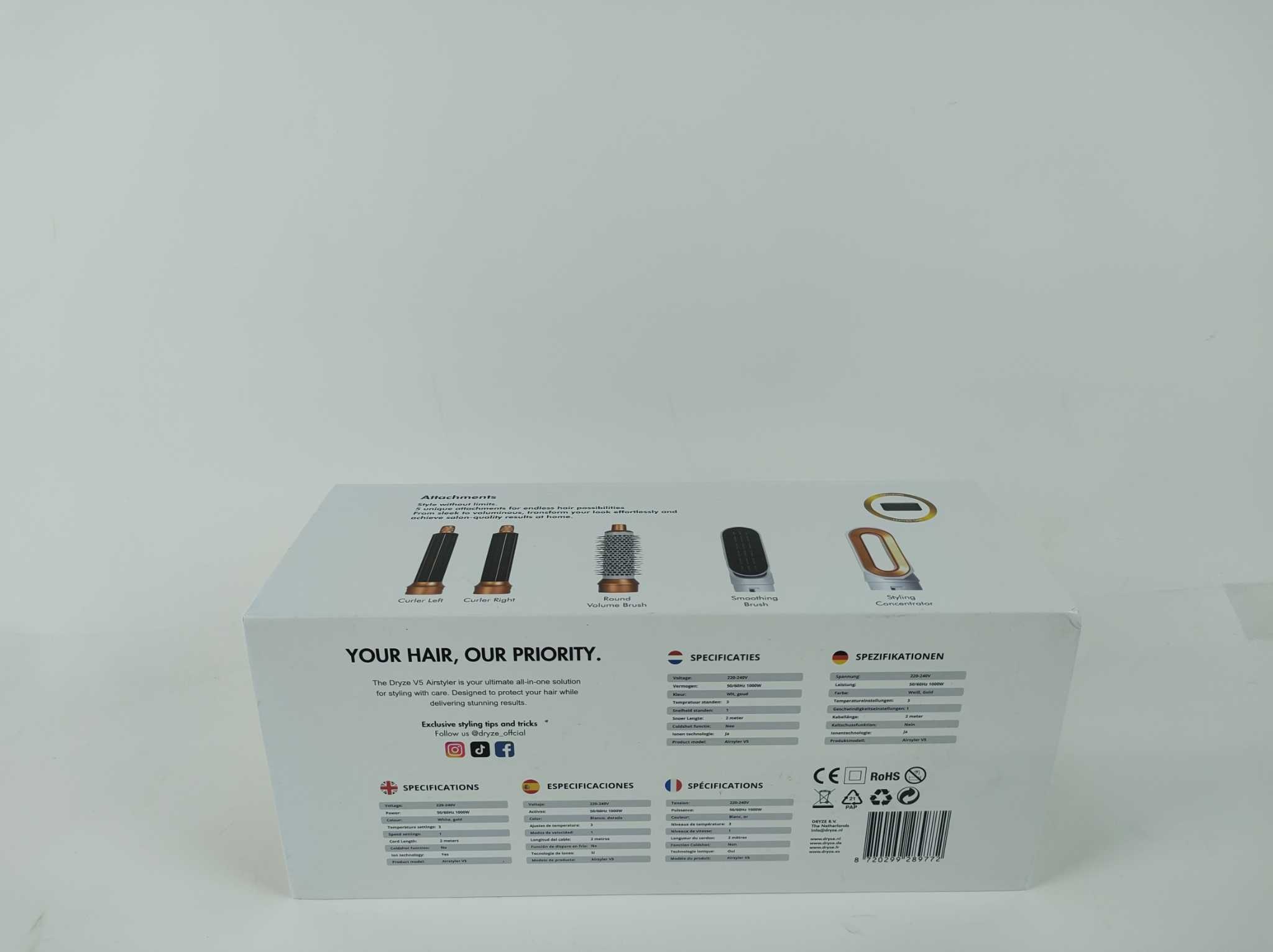 Dryze Multistyler 5-in-1 - Wit/Goud. De Dryze Airstyler White/Gold Edition is een veelzijdige 5-in-1 multistyler voor drogen, steilen, krullen en extra volume met één apparaat. Dankzij het Coandă-effect, ionentechnologie en keramische coating style je je haar sneller en met minder pluis of hittebelasting. De vier warmtestanden maken hem geschikt voor verschillende haartypes en looks. Inclusief föhnmond, gladde borstel, volumeborstel, linker en rechter krulopzetstuk plus leren opbergcase, zodat je compleet en overzichtelijk kunt stylen met salonwaardige resultaten thuis voor zowel kort als lang haar zonder gedoe.