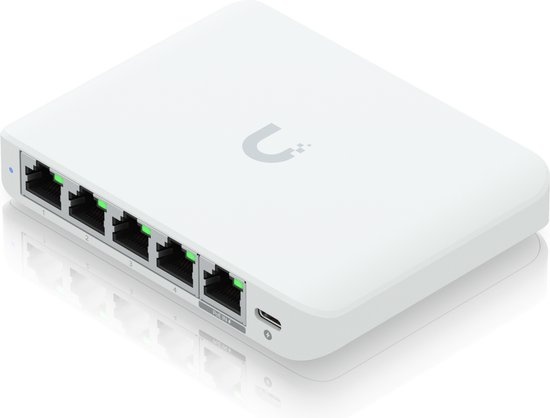 Ubiquiti Netwerkswitch UniFi Flex Mini. De Ubiquiti UniFi Flex Mini 2.5G is een compacte managed switch met 5 snelle 2,5GbE-poorten voor thuisnetwerk, kantoor en gaming. Met 25 Gbps switchingcapaciteit krijg je lage latency en hoge doorvoer voor Wi-Fi 6 access points en NAS. Poort 1 ondersteunt PoE-in voor voeding; alternatief is voeden via USB-C. Beheer alles centraal in UniFi Network met VLAN’s, QoS en port mirroring. Fanloos ontwerp blijft stil en koel op je bureau. Meegeleverd: switch, montageset en (afhankelijk van verpakking) 5V USB-C adapter.