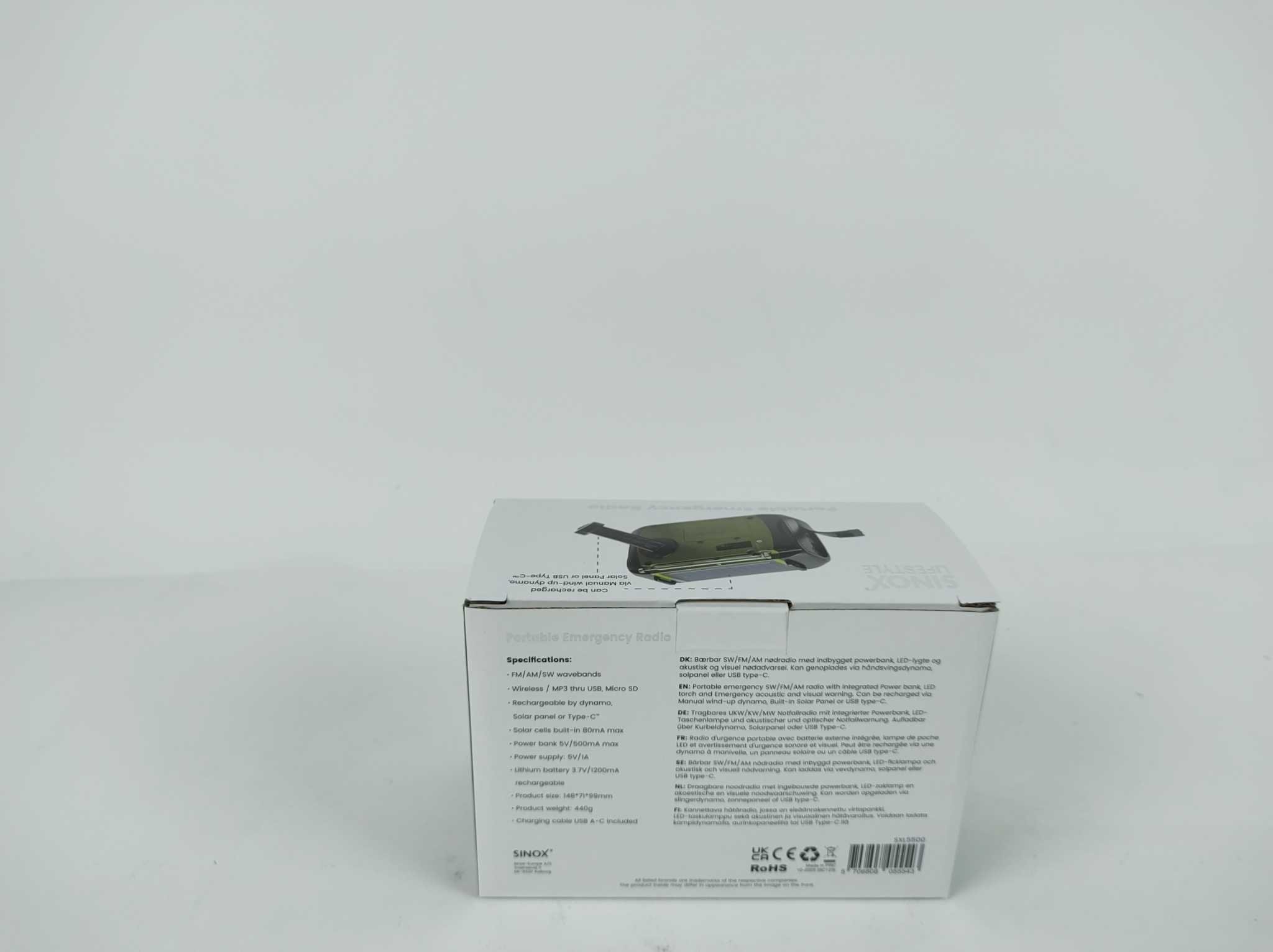 Sinox Noodradio SXL5500 - Groen. De Sinox SXL5500 noodradio combineert veiligheid, gebruiksgemak en veelzijdigheid in één compact apparaat. Met FM-, AM- en SW-radio, Bluetooth, MP3-weergave via USB en Micro SD blijf je overal geïnformeerd en verbonden. De ingebouwde LED-lamp, noodalarm en powerbank maken hem ideaal voor kamperen, reizen en noodsituaties. Opladen kan via zonne-energie, handslinger of USB-C, zodat je ook zonder stopcontact voorbereid bent. Dankzij het draagbare ontwerp neem je deze alles-in-één radio eenvoudig mee en beschik je altijd over licht, muziek en stroom onderweg.