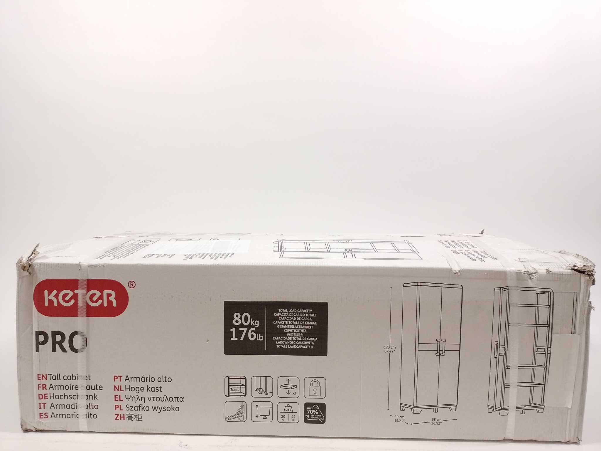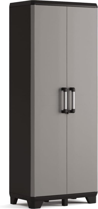 Keter Opbergkast Pro - 68×39×173 cm - Zwart/Grijs. De Keter Pro opbergkast (zwart/grijs) brengt orde in garage, schuur of bijkeuken. Vier verstelbare legplanken dragen elk 20 kg, terwijl afsluitbare deuren en aluminium handgrepen voor veiligheid en gebrui