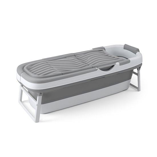 FlinQ Opvouwbaar Ligbad - Grijs. Ontspan thuis in het FlinQ opvouwbaar ligbad in grijs, ideaal voor badkamers zonder vaste badkuip. Het XXL formaat 158×60×53 cm biedt 385 liter en laat volwassenen languit liggen. In één minuut uit te klappen en na gebruik compact op te bergen (slechts 22 cm hoog). De afdekkap houdt water warmer en dient als tafeltje. Met voetmassagezone, neksteun en douchekophouder. Inclusief afvoerslang en opbergbakje voor zeep of drinken. Perfect voor een thuis-spa, ook handig voor kinderen en logees in kleine ruimtes.