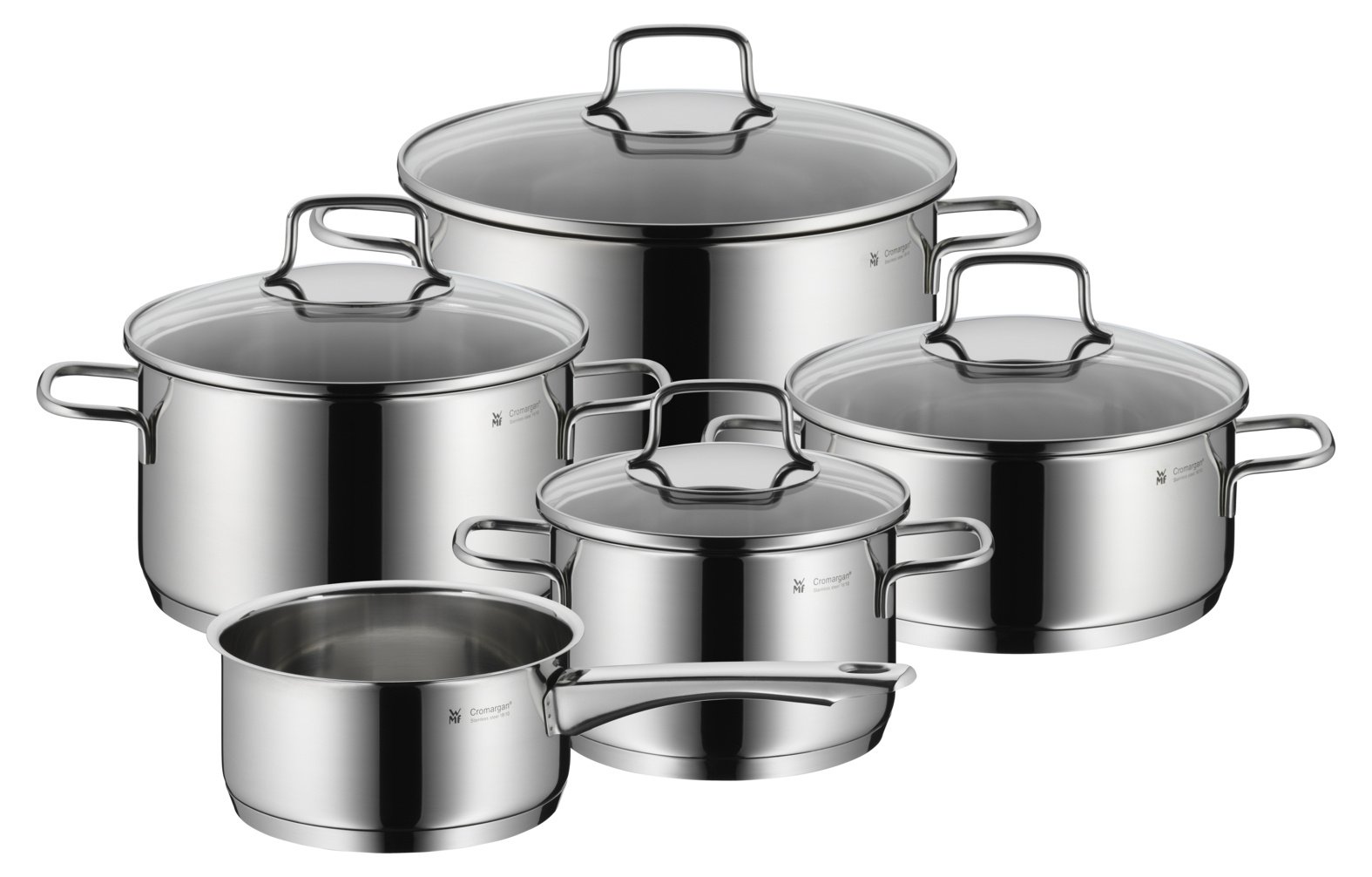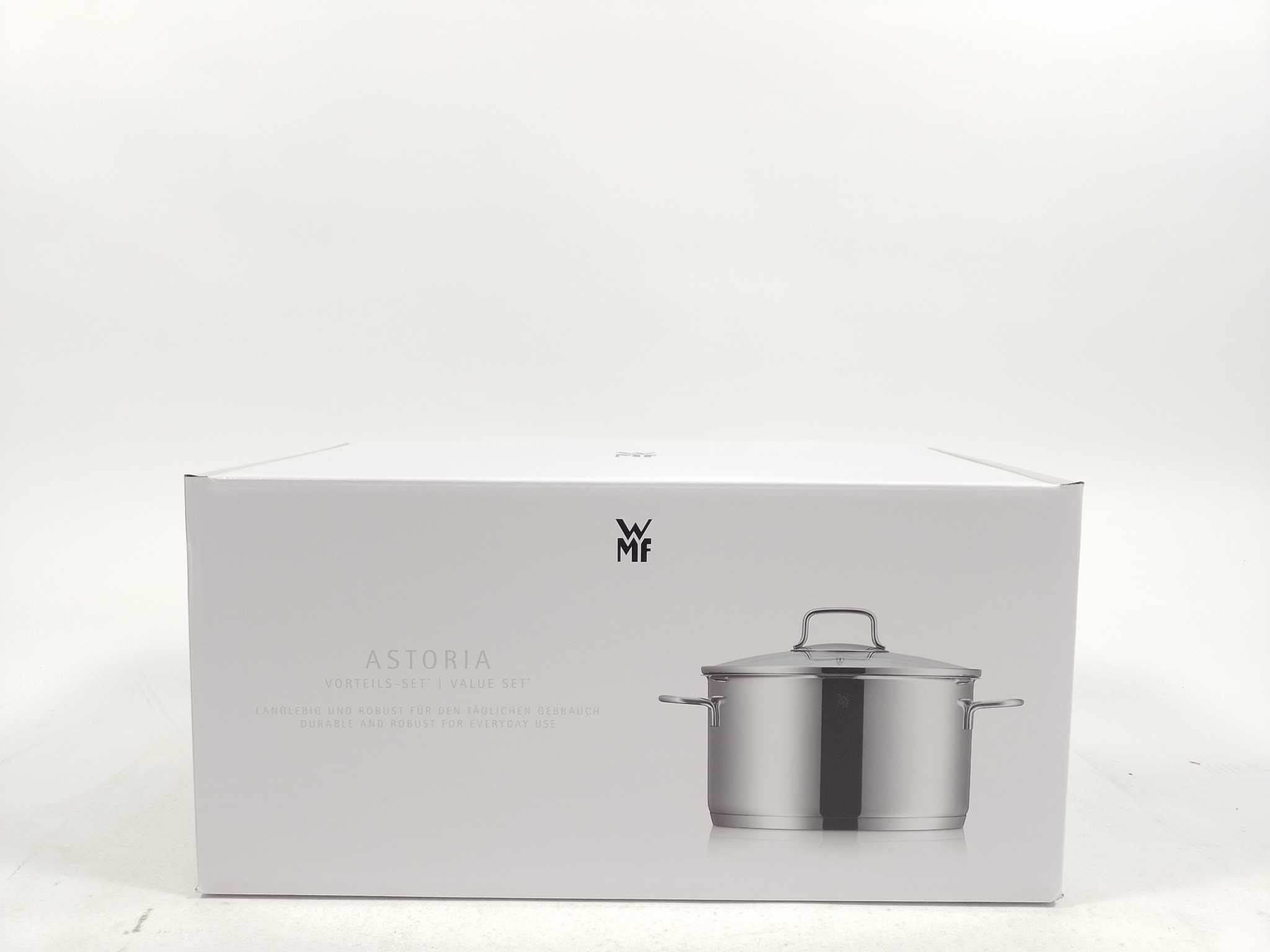 WMF Pannenset Astoria 5-delig. De WMF Astoria pannenset 5-delig brengt premium kookcomfort naar elke keuken. Gemaakt van slijtvast 18/10 roestvrij staal met TransTherm universeelbodem voor snelle, gelijkmatige warmte op alle warmtebronnen, inclusief induc