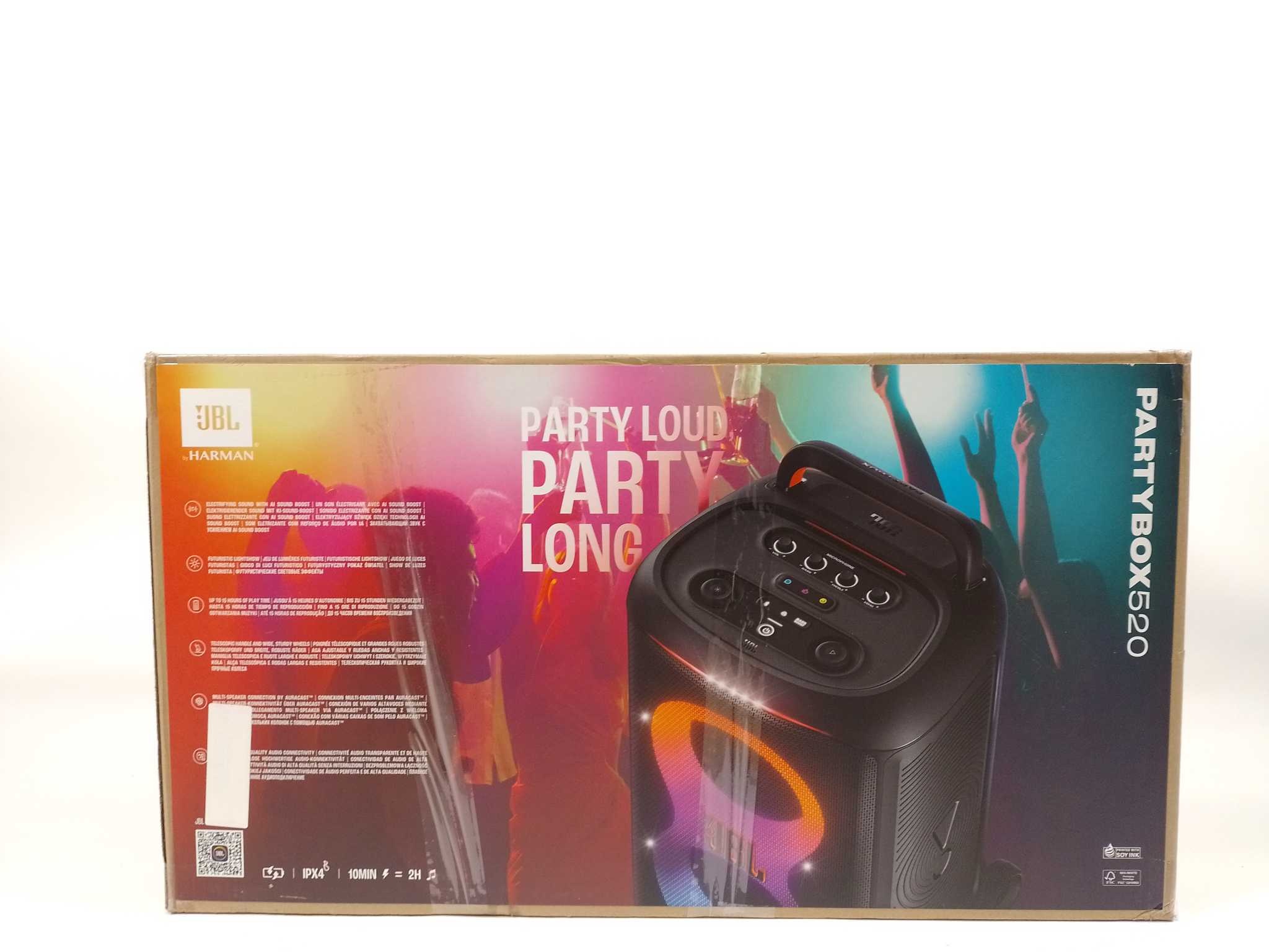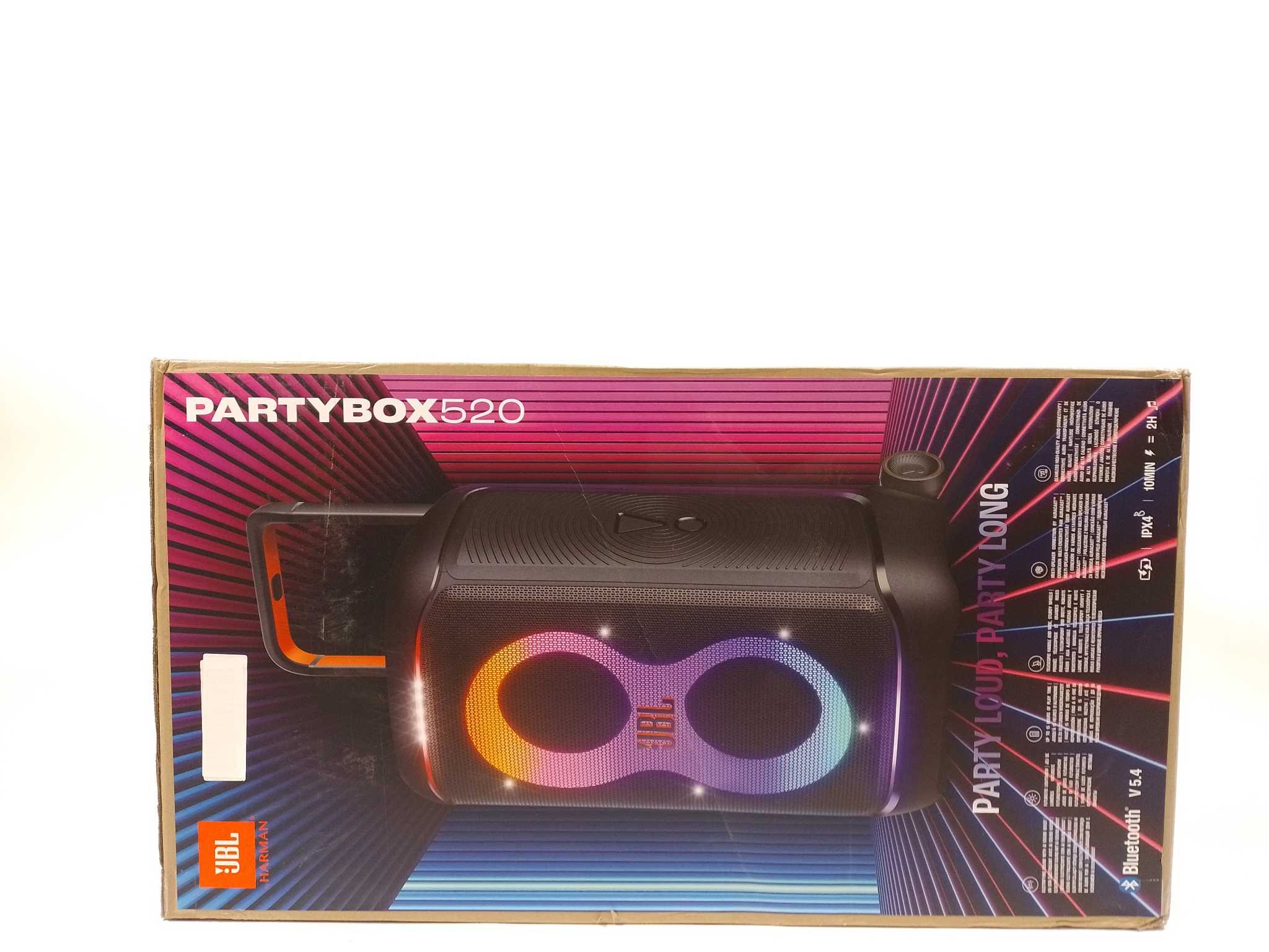 JBL Partybox 520 - Zwart. JBL PartyBox 520 is de ultieme draagbare partyspeaker met 400W JBL Pro Sound en AI Sound Boost voor hard volume zonder vervorming. De dynamische lichtshow laat elke beat zien. Geniet tot 15 uur speeltijd en snelladen: 10 minuten