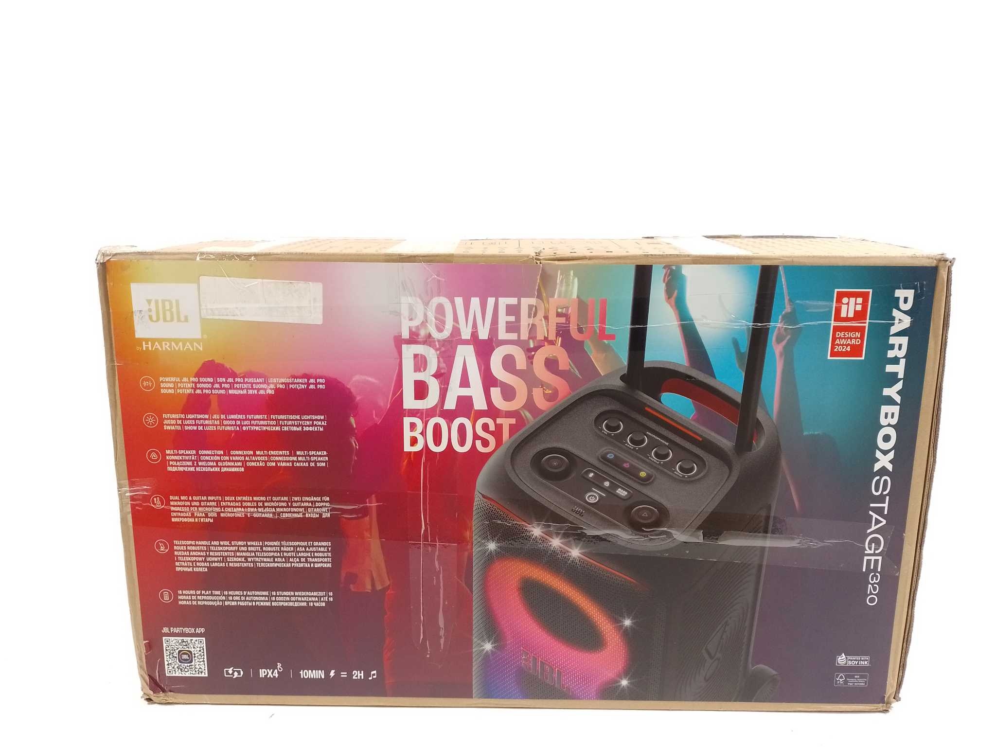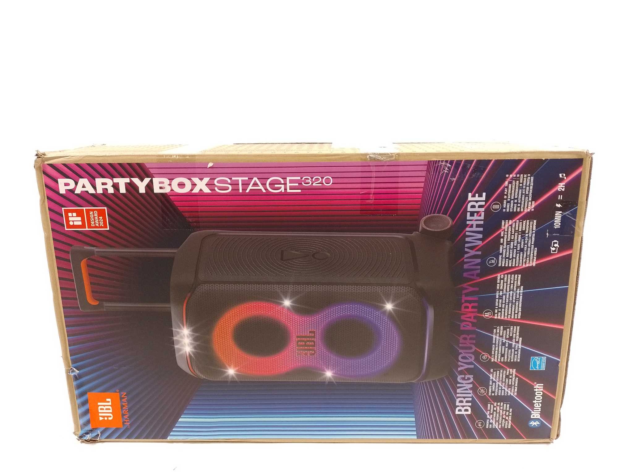 JBL Partybox Stage 320 - Zwart. Breng elk feest tot leven met de JBL PartyBox Stage 320: 240W JBL Pro Sound, futuristische lichtshow, 18 uur accu en IPX4-spatwaterdicht. Twee 6,5″ woofers en twee 1″ tweeters zorgen voor diepe bassen en sprankelende highs.