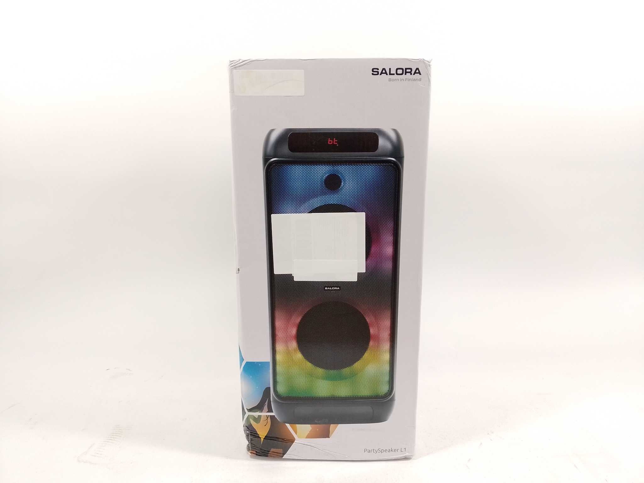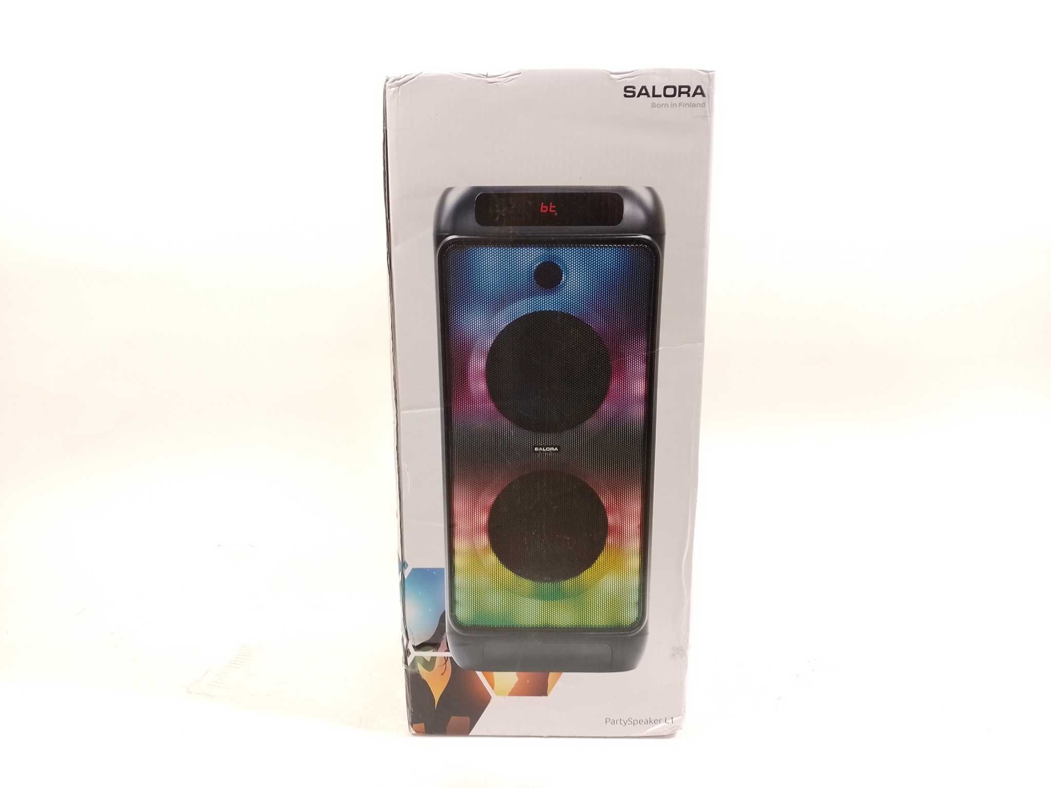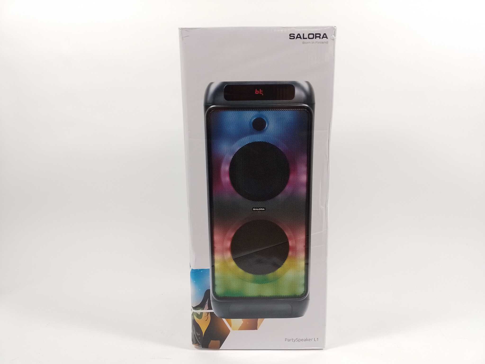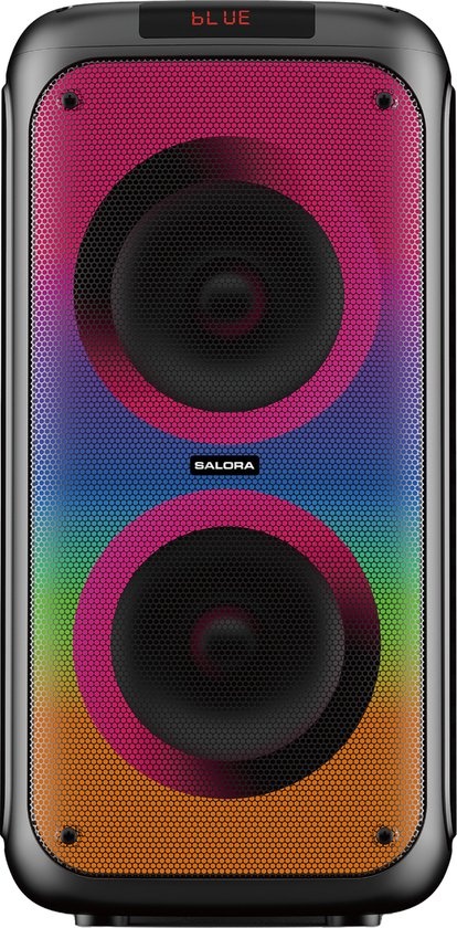 Salora PartySpeaker L1. Zet elk feest aan met de Salora PartySpeaker L1, een draagbare partyspeaker met full-color LED-lichtshow en krachtig 400W party-geluid. Stream via Bluetooth 5.0, speel MP3’s vanaf USB of sluit via AUX aan. De interne accu levert tot 5 uur speeltijd; opladen gaat eenvoudig via netstroom. Inclusief bedrade microfoon voor instant karaoke. Twee 6,5-inch woofers zorgen voor stevige bas. Compact (26,5×61,5×24,5 cm). Meegeleverd: microfoon, afstandsbediening en netadapter. Ideaal voor woonkamer, tuinfeest of camping. Klaar voor mobiel geluid met indrukwekkende visuele effecten.