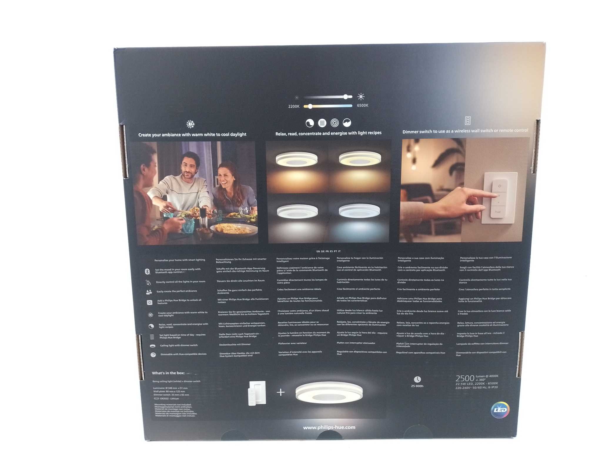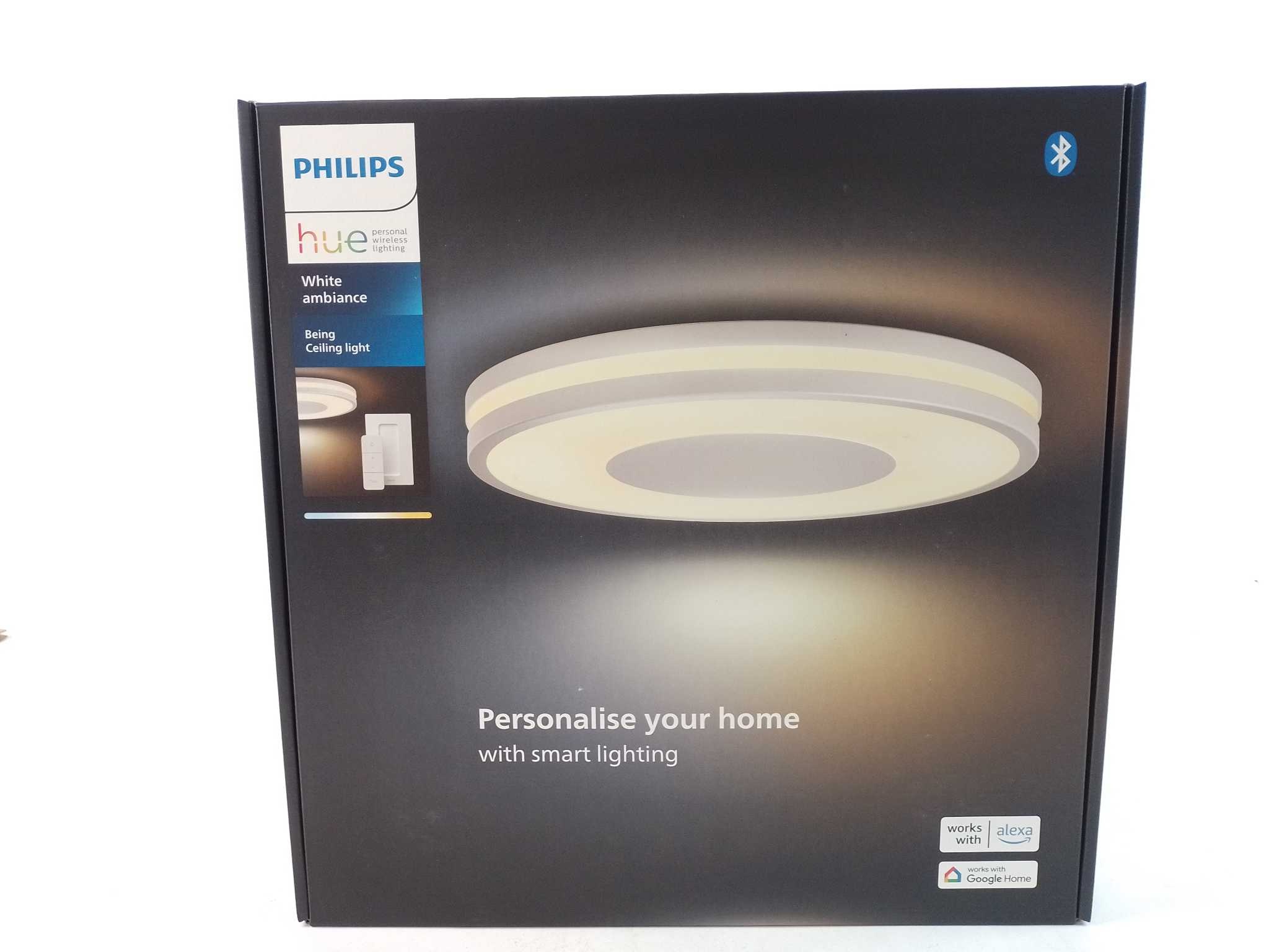 Philips Hue Plafondlamp Being - Wit. Breng sfeer en functioneel licht samen met de Philips Hue Being plafondlamp in wit. De geïntegreerde White Ambiance LED (22,5 W) schakelt van extra warm tot koelwit (2200–6500K) en schijnt in drie richtingen voor een zachte gloed. Bedien via Bluetooth of voeg een Hue Bridge toe voor timers, scènes en automatiseringen. Inclusief Hue Dimmer Switch voor direct dimmen en schakelen. Strak, dun ringdesign past perfect in keuken, woonkamer of slaapkamer. Inclusief montagemateriaal en handleiding met stille werking en energiezuinige prestaties.