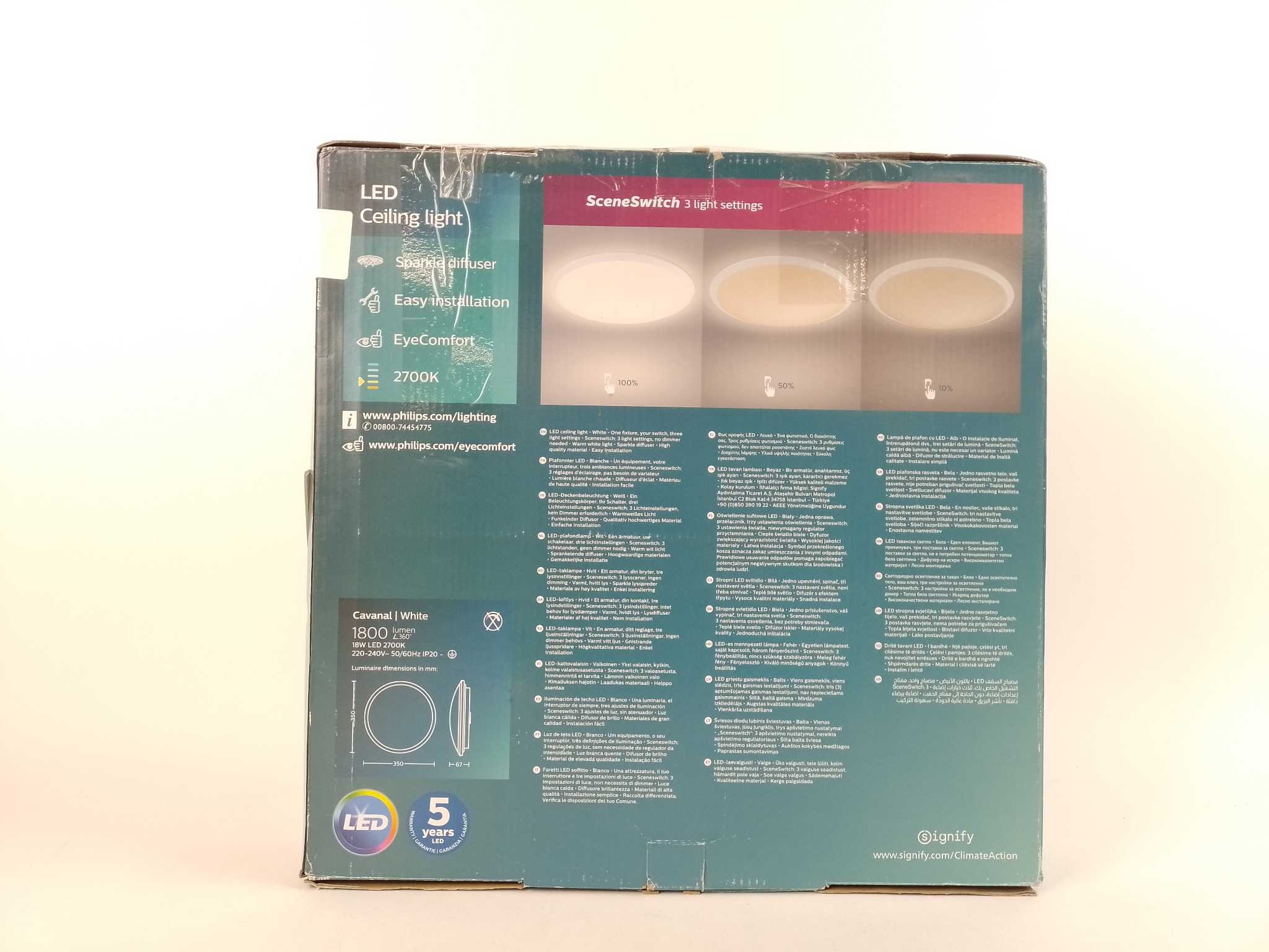 Philips Plafondlamp Cavanal - Ø35 cm - Wit. Philips Cavanal plafonnière Ø35 cm levert warm, gelijkmatig licht met ingebouwde 18W LED. Met SceneSwitch kies je via je bestaande schakelaar drie standen (1500/750/150 lm) zonder dimmer. Het slanke, witte design (6,7 cm hoog) past in woonkamer, hal of slaapkamer. IP20 en kunststof diffuser zorgen voor duurzaam, verblindingsarm licht en eenvoudig schoonmaken. Meegeleverd: montageplaat en bevestigingsmateriaal. Energiezuinig en direct klaar voor gebruik; ideale plafondlamp voor sfeervolle basisverlichting met moderne look en onderhoudsarme prestaties. Diameter 35 cm, kleurtemperatuur 2700K voor comfort.