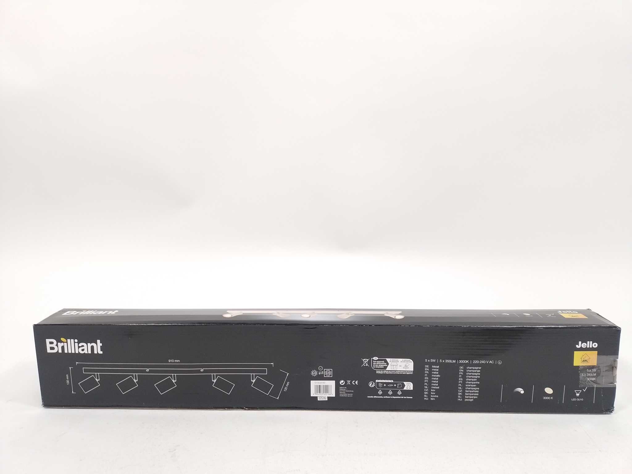 Brilliant Plafondlamp Jello - Champagne. Brilliant Jello plafondlamp in champagnekleur geeft jouw woonkamer, keuken of eetkamer direct sfeervol warm wit licht. De 91 cm balk heeft 5 kantelbare en draaibare GU10 LED-spots (5W, 350 lumen per spot, 3000K) voor gerichte verlichting boven tafel of werkblad. Dimbaar via een externe muurdimmer, ideaal voor elke sfeer. Metalen behuizing en IP20 voor binnengebruik. Inclusief lichtbronnen, montagemateriaal en handleiding. Creëer accentlicht in hal of slaapkamer; de spots zijn vervangbaar en energiezuinig, met heldere bundel en moderne uitstraling.