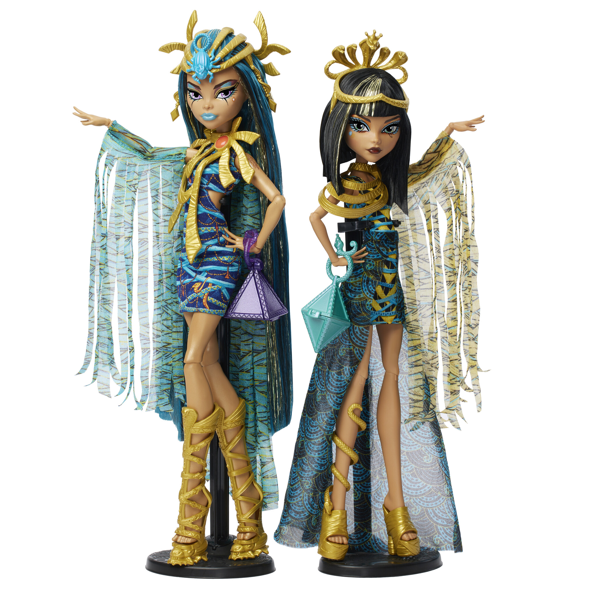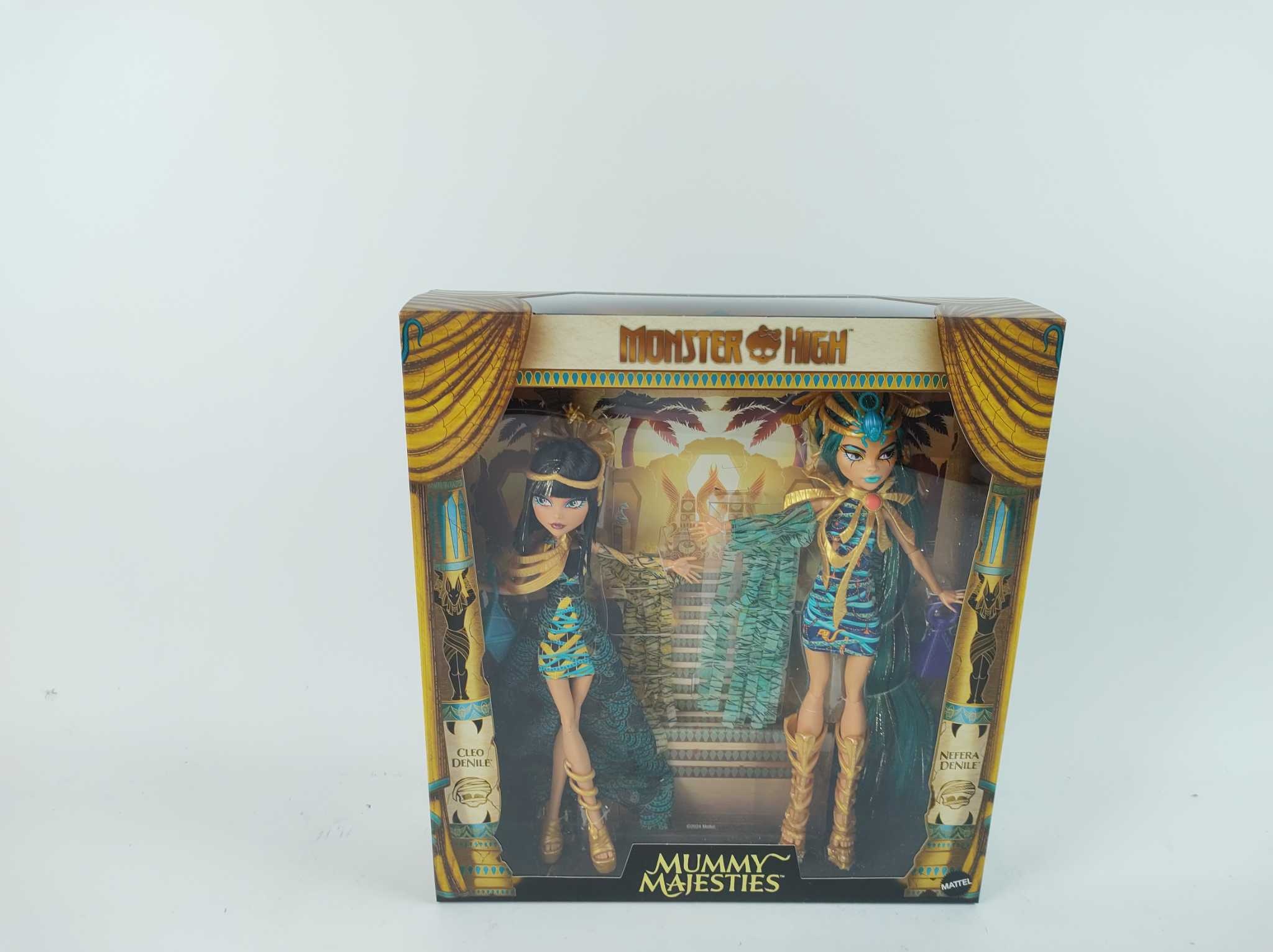 Monster High Poppenset Mummymajesteiten Cleo & Nefera. Monster High Mummy Majesties 2-pack viert Cleo en Nefera De Nile in vorstelijke outfits met glanzende details. Premium stoffen, franje-mouwen en gedurfde mummy-make-up springen eruit. Inclusief gouden
