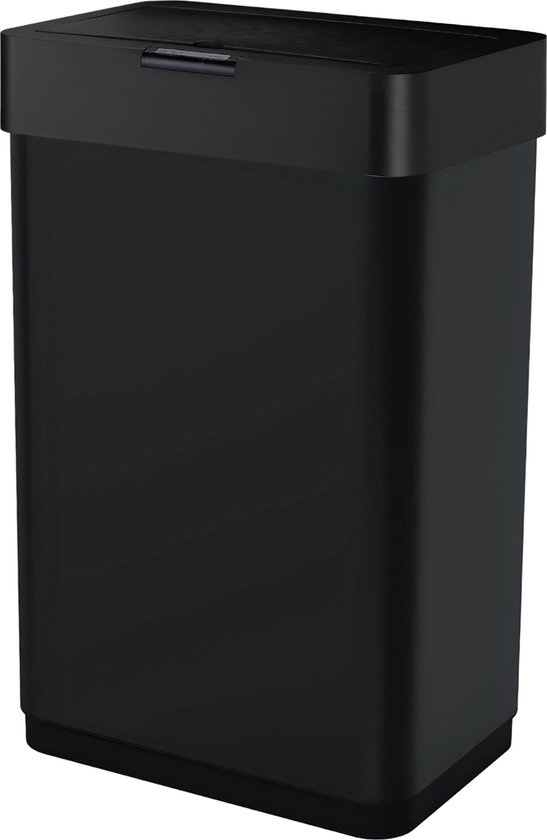 Five Stars Prullenbak met Sensor 60L - Zwart. Maak afval scheiden makkelijk met de sensorprullenbak 60 liter (2×30). Het matzwarte RVS ontwerp opent handsfree via bewegingssensor en sluit fluisterstil dankzij soft-close. Vingerafdrukbestendige afwerking blijft netjes. Rechthoekig, ruimtebesparend design past strak tegen de muur. Ideaal voor keuken of kantoor. Inhoud is eenvoudig te verdelen met scheidingsring. Werkt op batterijen. Meegeleverd: sensorprullenbak. Hygiënisch, geurafsluitend en stijlvol; perfecte combinatie van gemak en design voor dagelijks gebruik. Matte coating voorkomt vlekken, scheidingsring houdt zakken strak en wisselen eenvoudig.