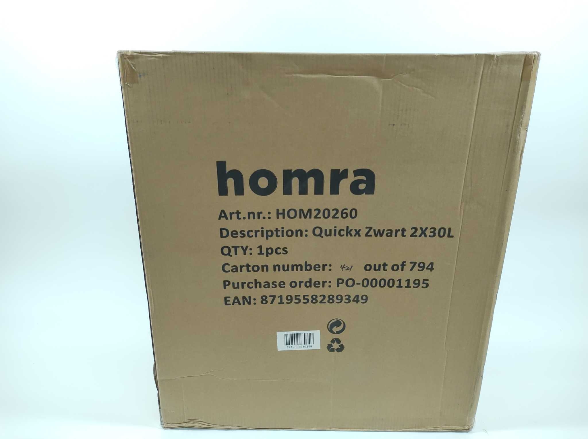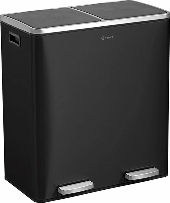 Homra Prullenbak Quickx 60L - Zwart. De Homra Quickx duo prullenbak 60 liter is een stijlvolle pedaalemmer voor slimme afvalscheiding in huis of op kantoor. Met twee compartimenten van 30 liter houd je restafval, plastic of papier netjes gescheiden zonder extra ruimteverlies. De uitneembare binnenemmers maken legen en schoonmaken eenvoudig. Dankzij de soft close deksels, het stevige voetpedaal en de robuuste stalen behuizing geniet je dagelijks van comfort en duurzaamheid. De matzwarte afwerking zorgt bovendien voor een moderne, strakke uitstraling in elke ruimte van je woning.