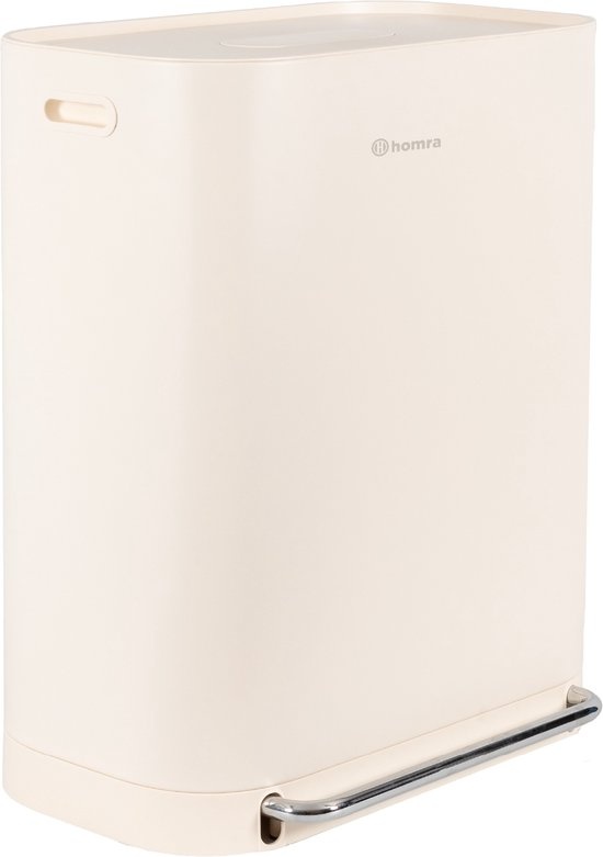 Homra Prullenbak Rockx 60L - Creme/Wit. De Homra Rockx duo pedaalemmer 60 liter in crème wit is een stijlvolle oplossing voor eenvoudig afval scheiden in huis of op kantoor. Met twee compartimenten van elk 30 liter houd je restafval en plastic overzichtelijk gescheiden. De afmetingen van 32,5 x 58 x 68,5 cm maken deze afvalbak ruim en praktisch zonder log te ogen. Dankzij de uitneembare binnenemmers, geurfilter, brede voetpedalen en geruisloze sluiting biedt hij dagelijks comfort, hygiëne en een nette uitstraling in elke keuken.