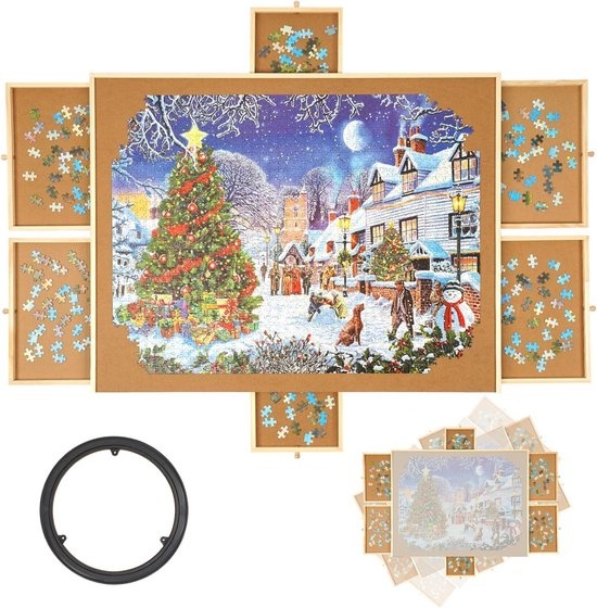 DreamGoods Puzzelbord - 1500 stuks. Maak puzzelen comfortabel met het DreamGoods draaibaar puzzelbord voor 1000 tot 1500 stukjes. Het stevige houten werkblad draait soepel, zodat je elke hoek bereikt zonder te schuiven. Zes uitschuifbare opberglades houde
