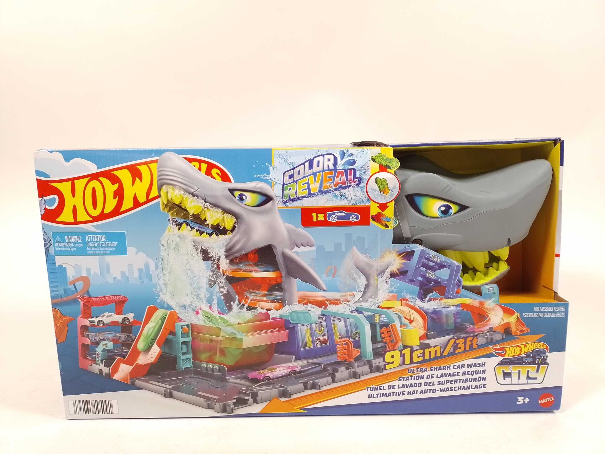 Hot Wheels Racebaan - Ultra Shark Car Wash. De Hot Wheels Ultra Shark Car Wash Playset biedt een spannende autowaservaring met water- en kleurveranderingseffecten. Rijd de auto door het speelsysteem terwijl de reusachtige haai op de loer ligt! Met draaien