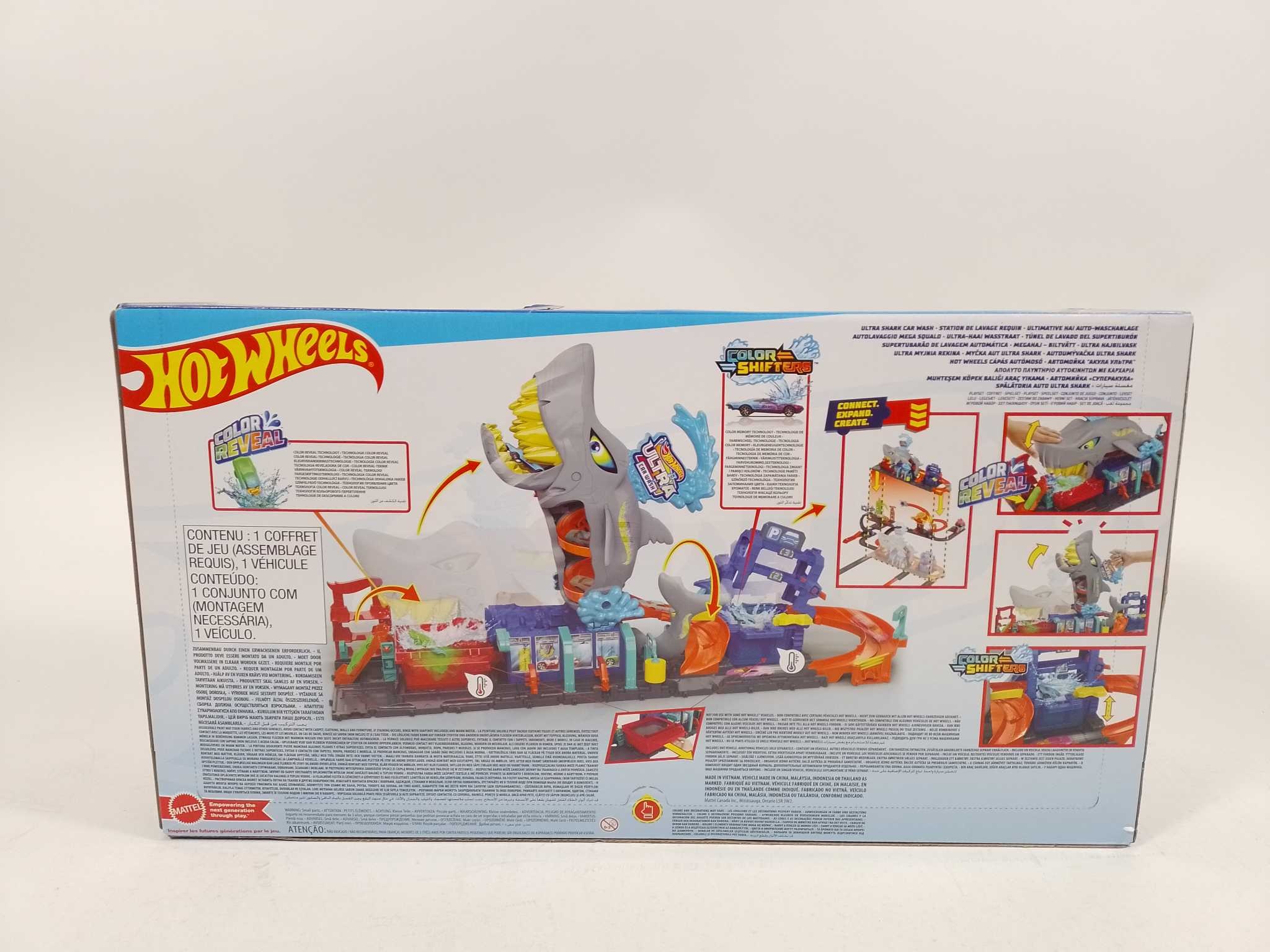 Hot Wheels Racebaan - Ultra Shark Car Wash. De Hot Wheels Ultra Shark Car Wash Playset biedt een spannende autowaservaring met water- en kleurveranderingseffecten. Rijd de auto door het speelsysteem terwijl de reusachtige haai op de loer ligt! Met draaiende borstels, een watertank en interactieve onderdelen beleef je eindeloos raceplezier. Perfect voor jonge autoliefhebbers! Type product: Racewagen & circuitset, Aanbevolen leeftijd (min): 3 jaar, Aanbevolen leeftijd (max): 99 jaar, Materiaal: Kunststof, Kleur van het product: Meerkleurig
