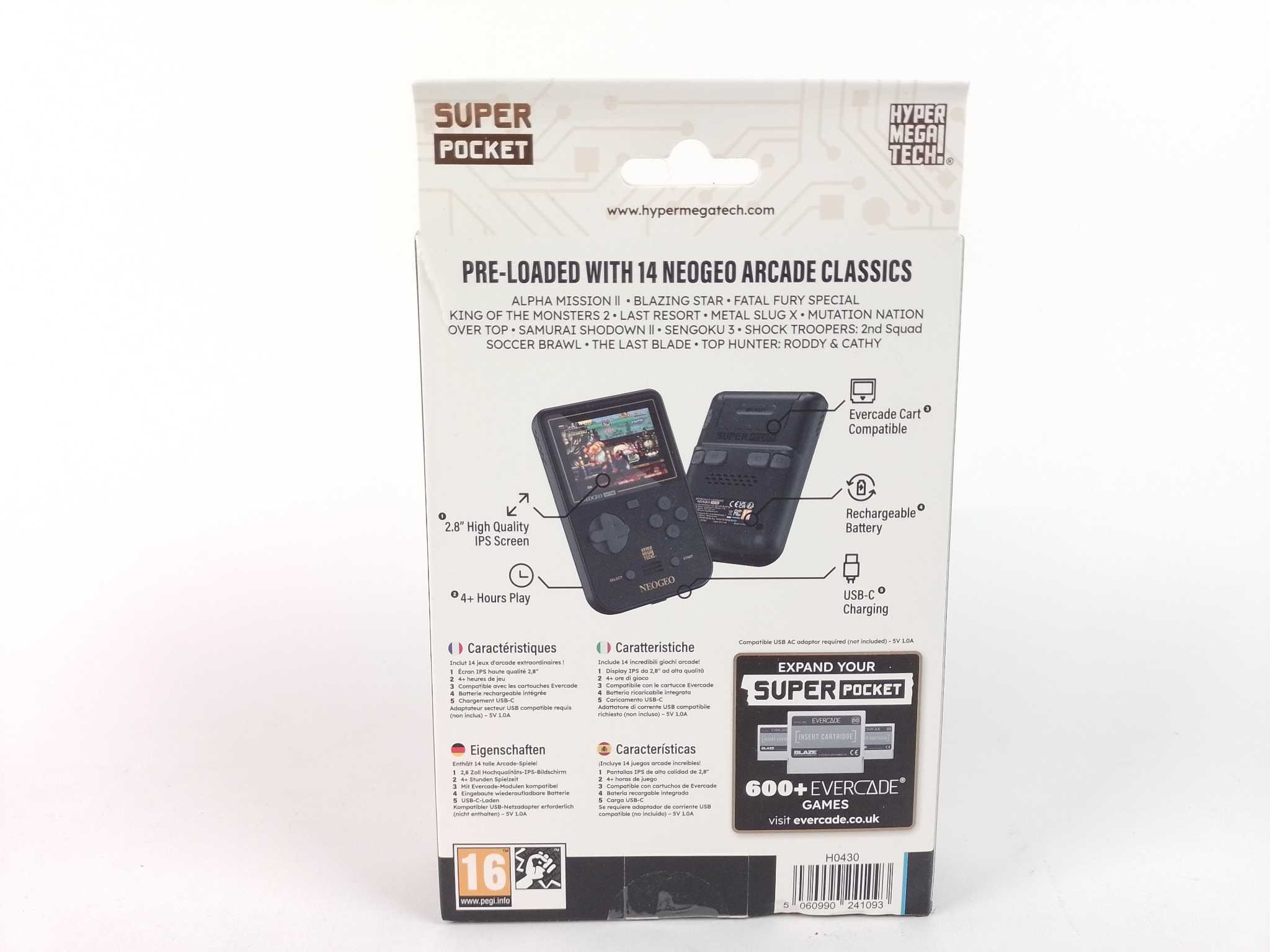 Plaion Retro Console Super Pocket Neogeo. Neem Neogeo-arcadeklassiekers overal mee met de Super Pocket, een compacte retro handheld voor Evercade. Speel 14 ingebouwde toppers via de meegeleverde NEOGEO-cartridge en geniet van een helder 2,8 inch IPS-scher