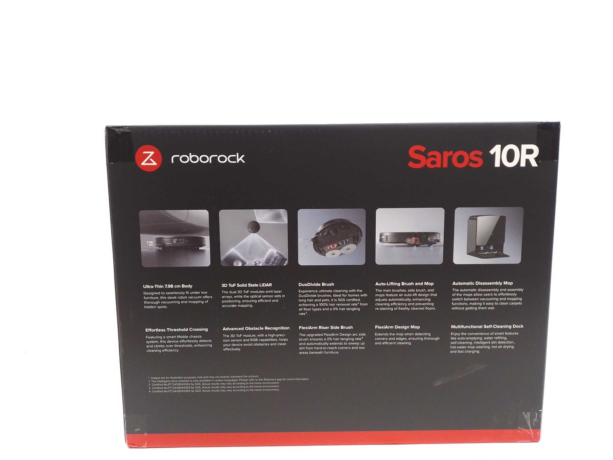 Roborock Robotstofzuiger Saros 10R - Zwart. De Roborock Saros 10R is een ultraslanke robotstofzuiger met dweilfunctie voor grondige, automatische schoonmaak. Met 22.000 Pa zuigkracht, AI-obstakeldetectie en vuildetectie reinigt hij hardnekkig vuil, ook onder meubels (7,98 cm hoog). Het zelfreinigende dock spoelt moppen met warm water en leegt stof automatisch. Multi-laagse mapping, no-go-zones en spraakbediening via app geven volledige controle. Inclusief multifunctioneel dock, stroomkabel, mopdoeken en stofzakken. Ideaal voor huisdieren, harde vloeren en tapijt; stil, krachtig en onderhoudsarm. Plan reiniging per kamer en tijden voor optimaal gemak.